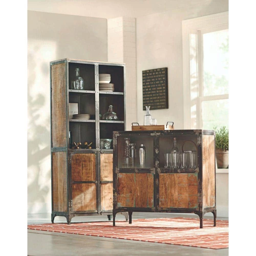 The rustic finish of the Manchester Cabinet gives a weathered appeal and provides sturdy, industrial-style storage. It can be used for living room storage as a cabinet to show off book, photos and collectibles. Also try it in the dining room to store china or linens. It is crafted of mango wood and metal in a rustic iron finish.