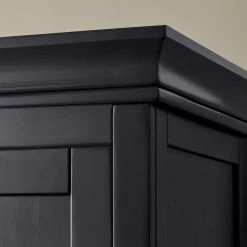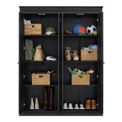 Add a stylish spot for storage in your home with the Mansell Black Wood Accent Storage Cabinet exclusively offered at Home Depot by the Home Decorators Collection. Standing at 78 inches tall, this large accent cabinet features two side-by-side vertical shelves that include a total of 8 interior shelves for ultimate storage. The four black, wooden cabinet doors are decorated in a classic trim with simple, black knobs and offer fully concealed storage. The stunning crown-molding detail along the top and bottom make this cabinet beautiful enough to be showcased in your bedroom suite or living room; and the durable MDF wood frame design makes it strong enough to serve as the entryway catch-all for sports equipment, instruments, and school supplies. The Mansell Black Accent Storage Cabinet comes in Black or White wood finishes and includes an anti-tipping design that ensures safety for even the most bustling family on the go.