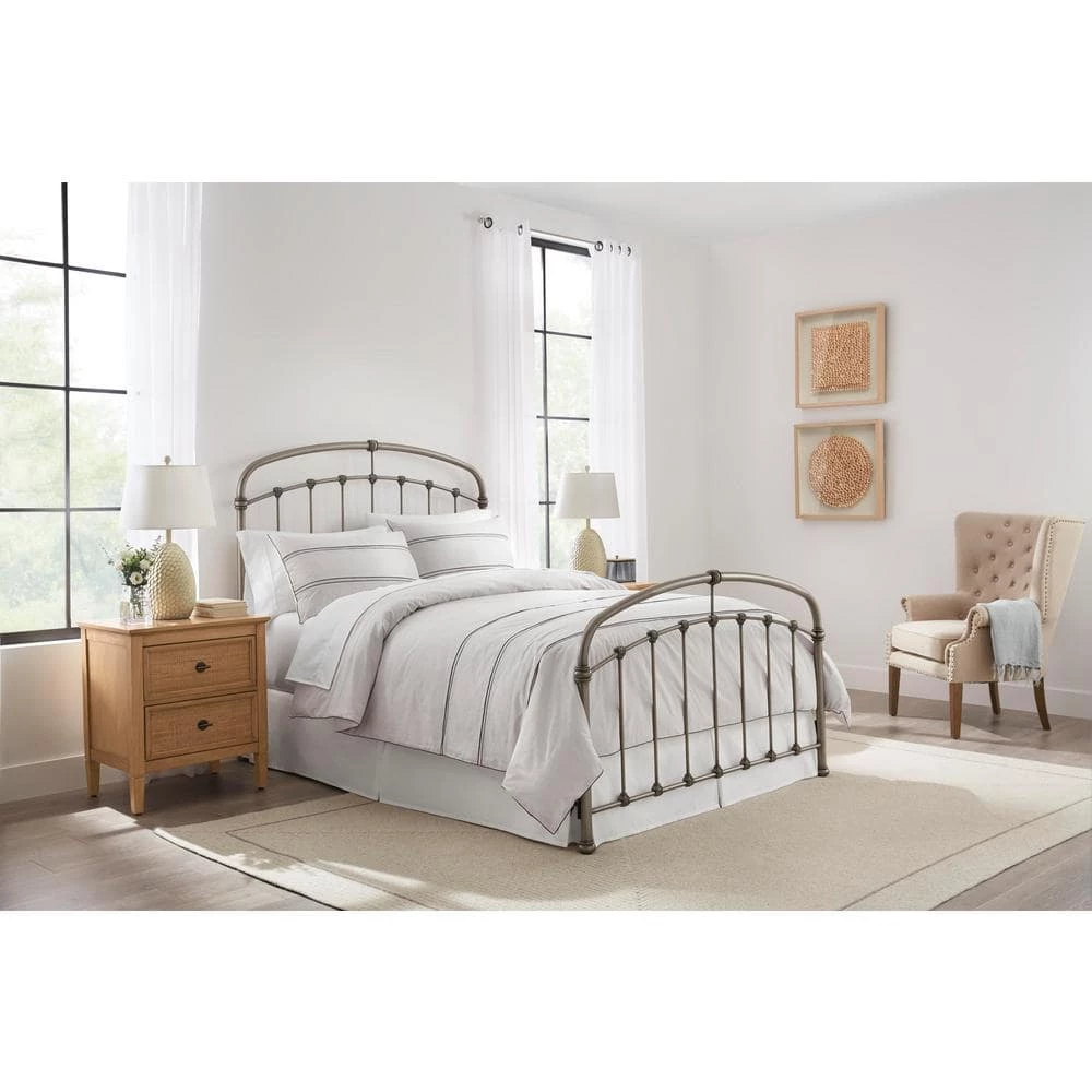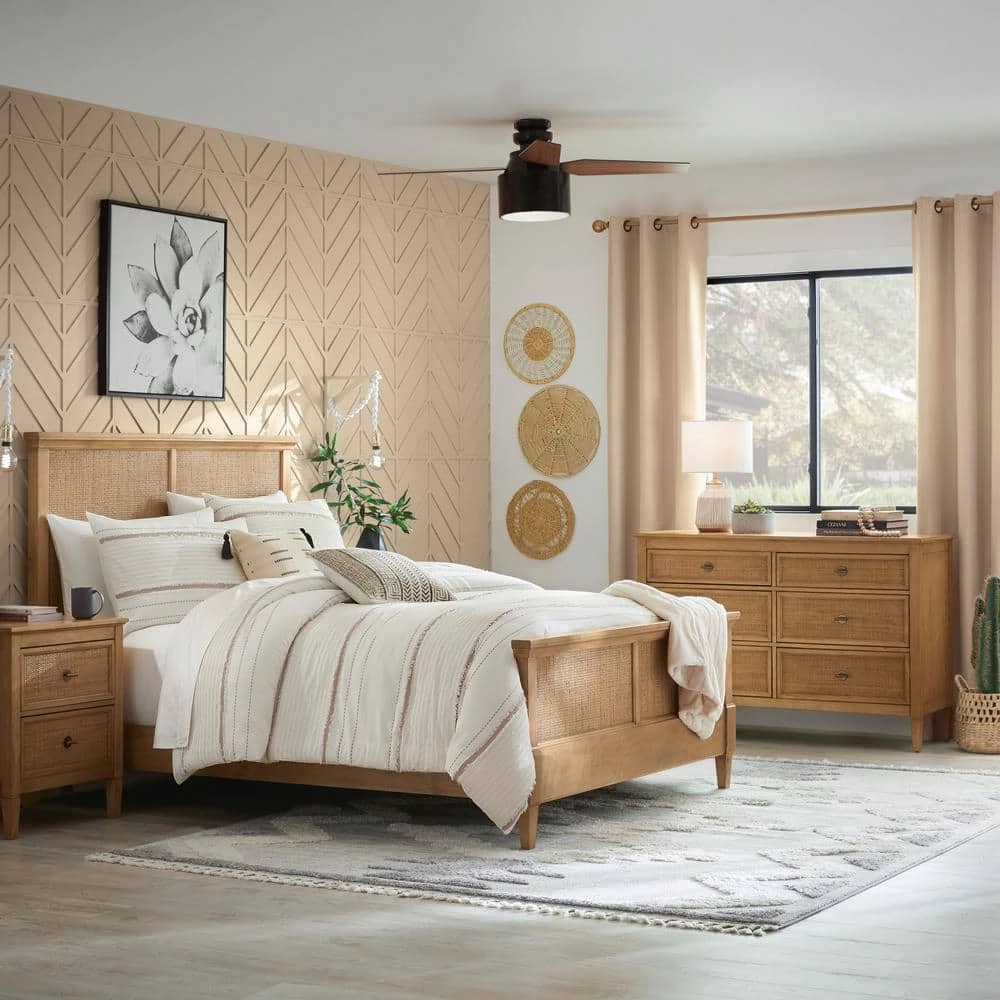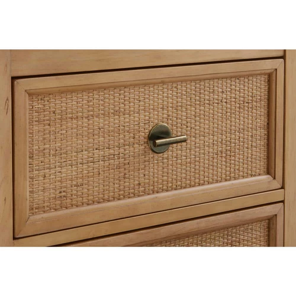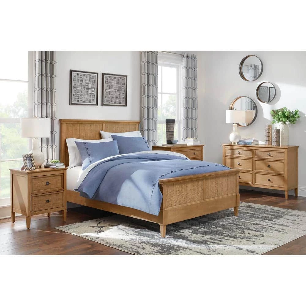 Classic wooden nightstand featuring two drawers for maximizing bedroom storage. Patina colored nightstand is finished with classic hardware. The two drawers consist of two medium drawers. The frame is constructed of wood and inlayed with woven can. Assembly required.