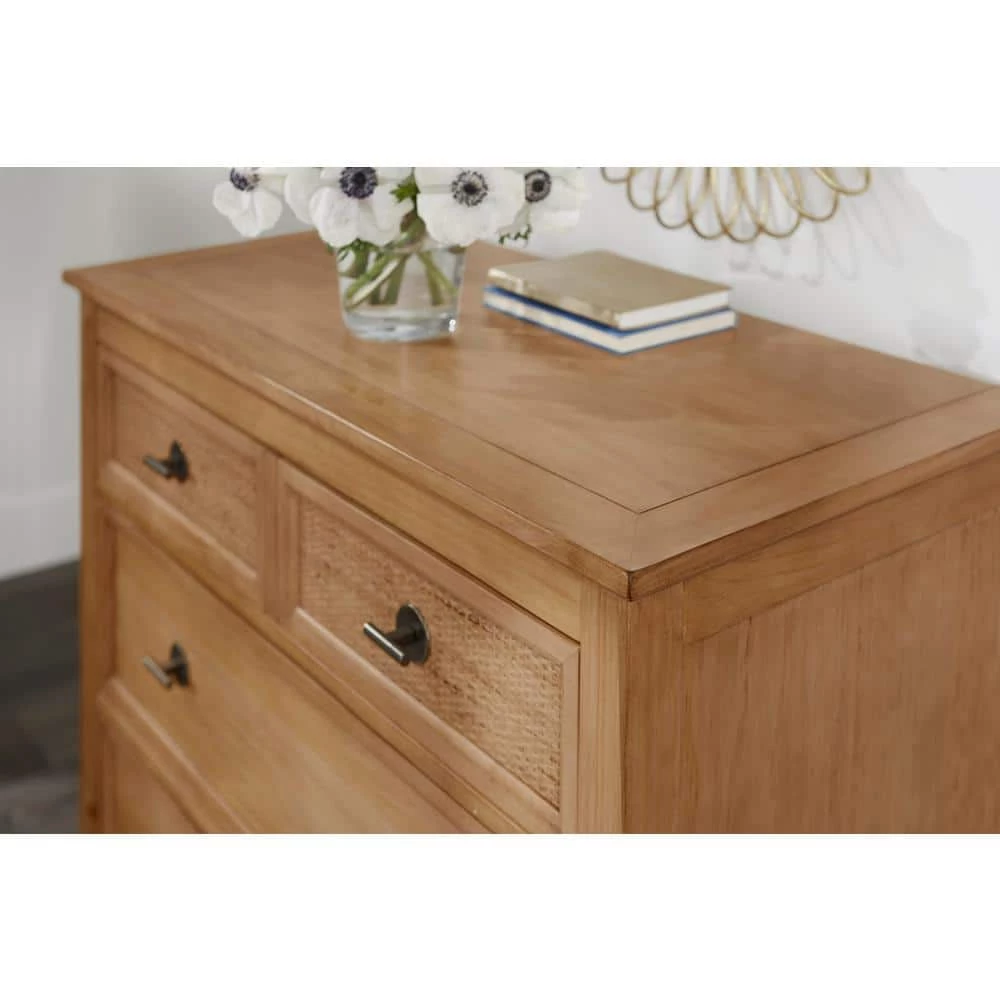 Classic wooden chest featuring four drawers for maximizing bedroom storage. Patina colored chest is finished with classic hardware. The four drawers consist of two large drawers and two smaller drawers. The frame is constructed of wood and inlayed with woven cane.