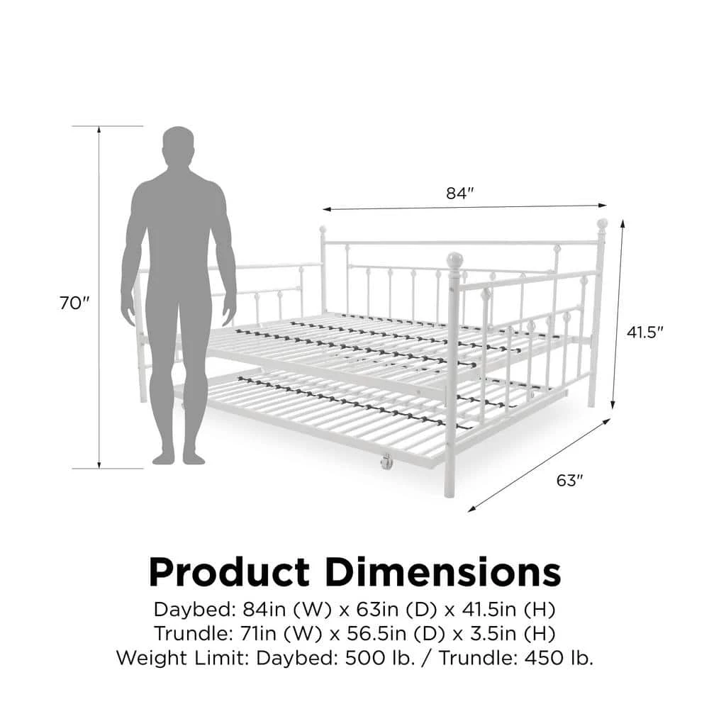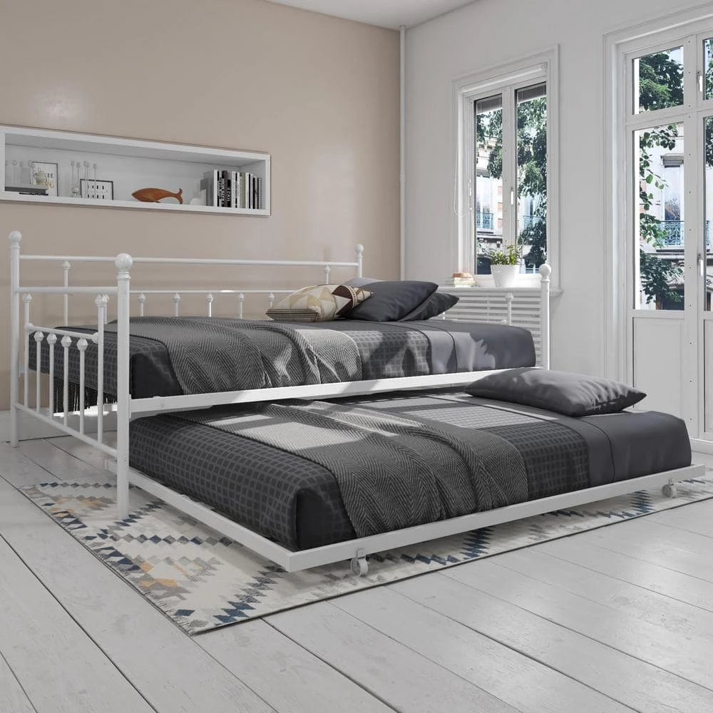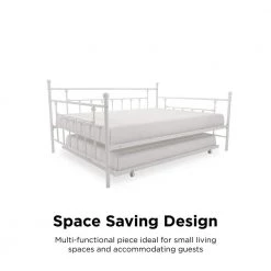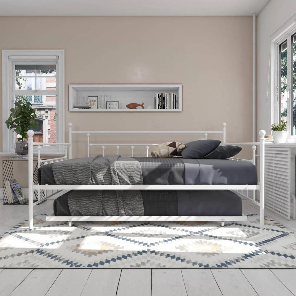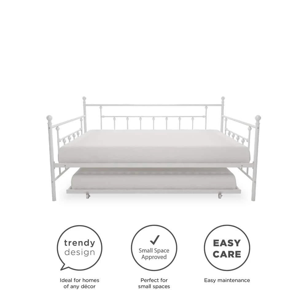 In need of extra space for overnight guest or sleepovers? Then the DHP Mia daybed with trundle is ideal for you! With a Victorian design that has rounded finials, this daybed gives a spark of style that’s both modern and timeless. The classic, chic and sturdy metal frame comes with metal slats for extra support while also ensuring air moves freely around your mattress to keep it fresh for years to come. The Mia daybed is perfect for overnight guests with its trundle: just effortlessly pull it out with its easy-glide casters and you’re all set. The Mia is also perfect for your kids as they can read, play and sit back during the day and sleep soundly at night. All you need are some pillows and throw blankets for color and you’re good to go!