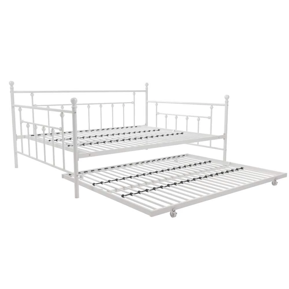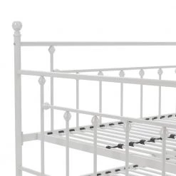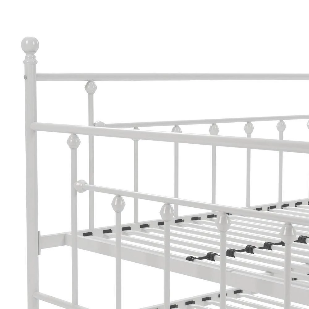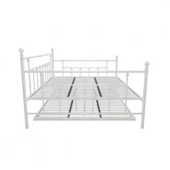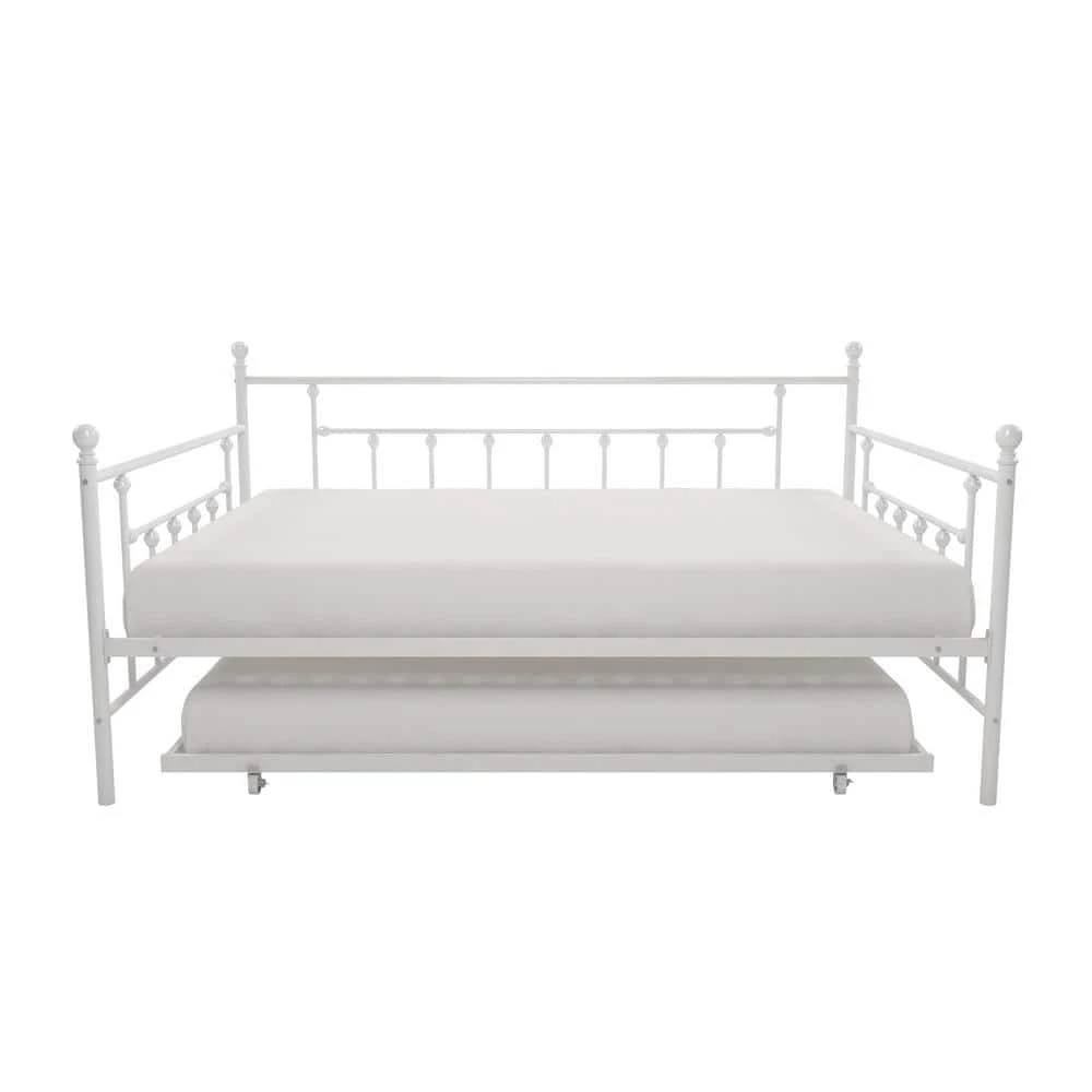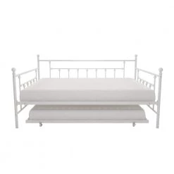 In need of extra space for overnight guest or sleepovers? Then the DHP Mia daybed with trundle is ideal for you! With a Victorian design that has rounded finials, this daybed gives a spark of style that’s both modern and timeless. The classic, chic and sturdy metal frame comes with metal slats for extra support while also ensuring air moves freely around your mattress to keep it fresh for years to come. The Mia daybed is perfect for overnight guests with its trundle: just effortlessly pull it out with its easy-glide casters and you’re all set. The Mia is also perfect for your kids as they can read, play and sit back during the day and sleep soundly at night. All you need are some pillows and throw blankets for color and you’re good to go!