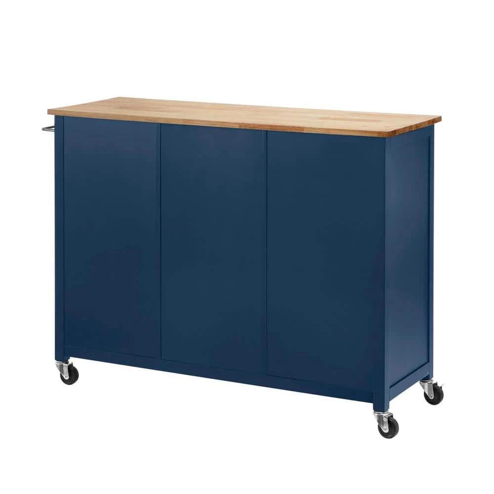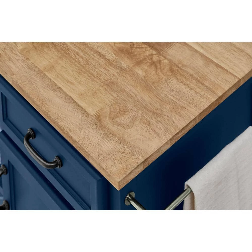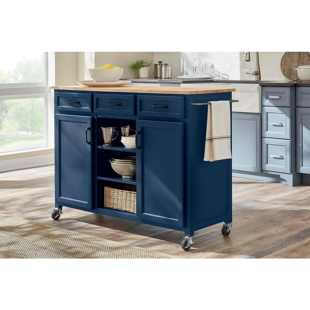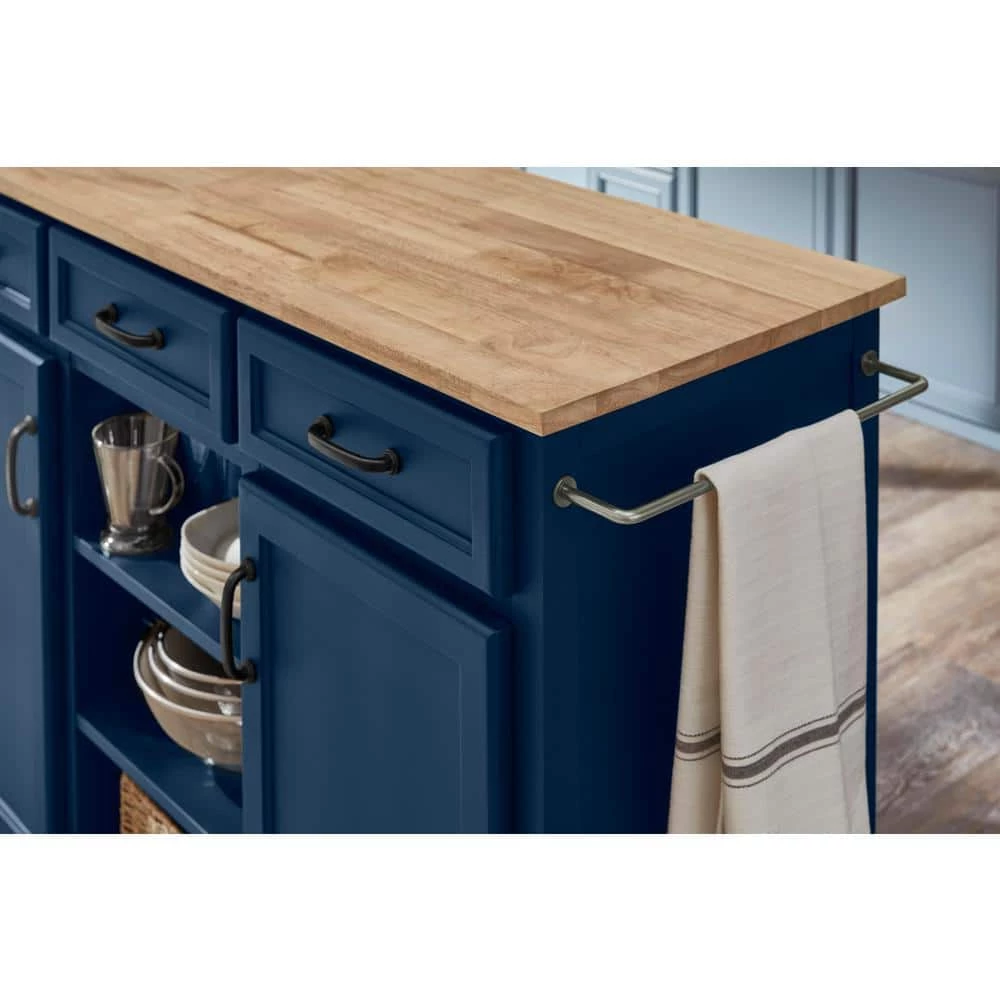 The Home Decorators Collection multi-tasking kitchen cart helps you work more efficiently in the kitchen. Classically styled cabinetry is painted midnight blue and arrives with two doors, three drawers, three open shelves and a pair of towel bars. The kitchen cart is crafted of wood and topped with a food-safe wood surface. The mobile cabinet rolls to wherever needed and locks safely in place.