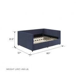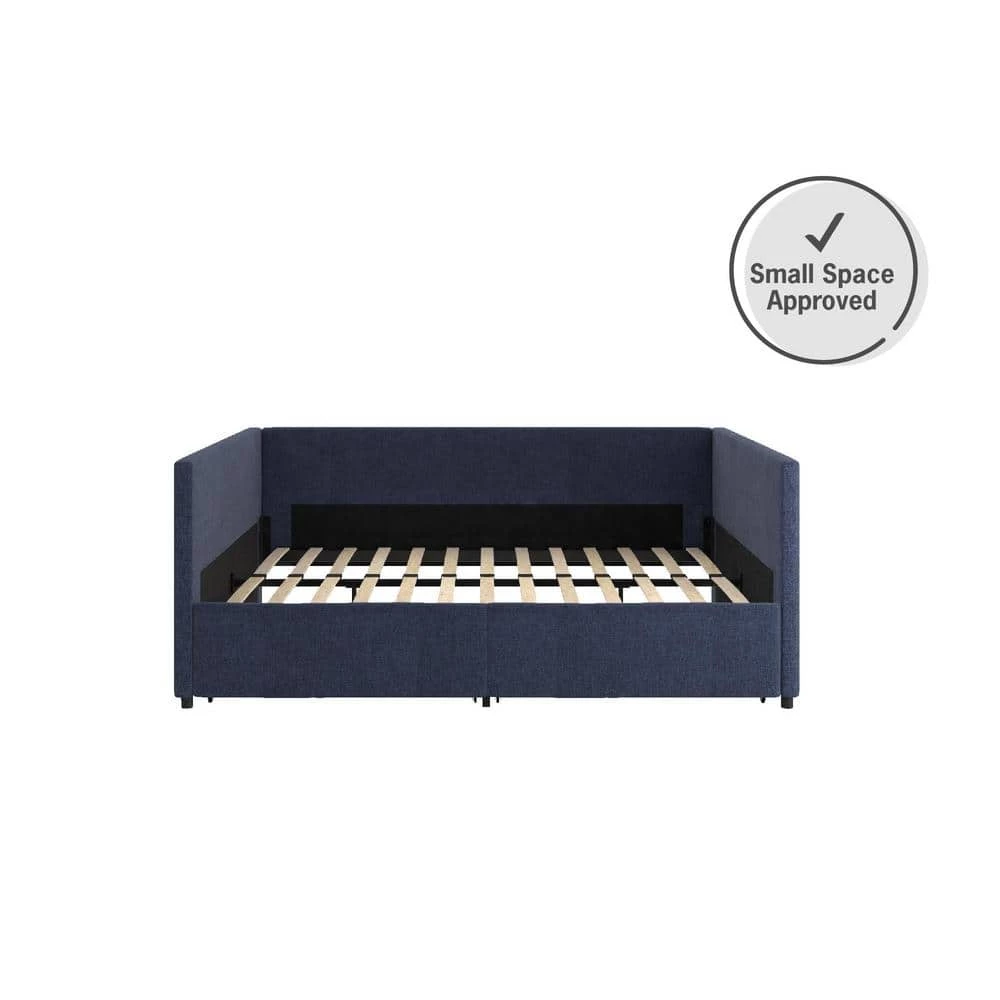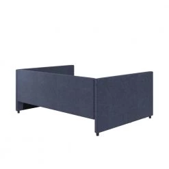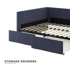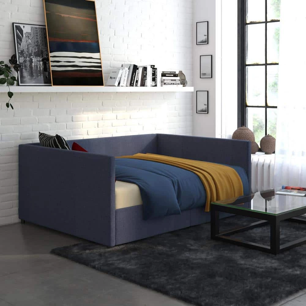 Style meets comfort and functionality with the DHP Mya Upholstered Daybed with Storage. Minimalism at its finest with clean lines and rich linen upholstery and a boxy cubical profile that introduces modern aesthetic into your living room. Ultimate functionality is incorporated through the addition of under bed drawers for storage, allowing you to conveniently store extra bedsheets, comforters set, magazines and the like without sacrificing more precious floor space. The bedframe comes with a wooden slats system that helps ventilation for your mattress, keeping it fresher longer. No box spring is required, just top this daybed with your favorite mattress and simply sleep the night away. Get your creative juice flowing by adding some colorful cushions and duvets to turn this daybed into a lounging area or as a chic accent piece to place against the wall as well as use as a room divider. Available in various colors and designed to fit a standard twin size mattress (sold separately), the Mya Upholstered Daybed with Storage is certainly ideal for small space living.
