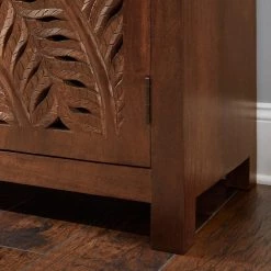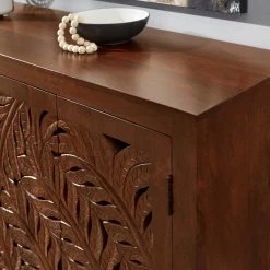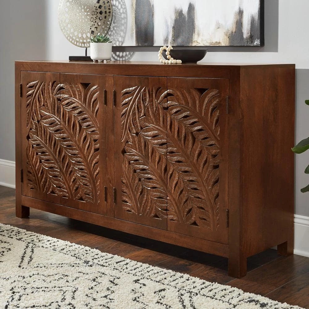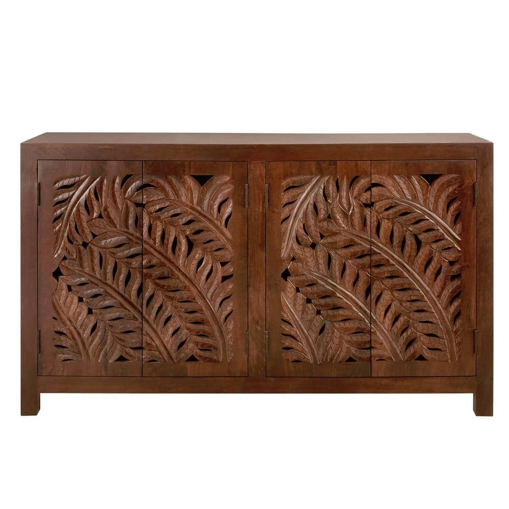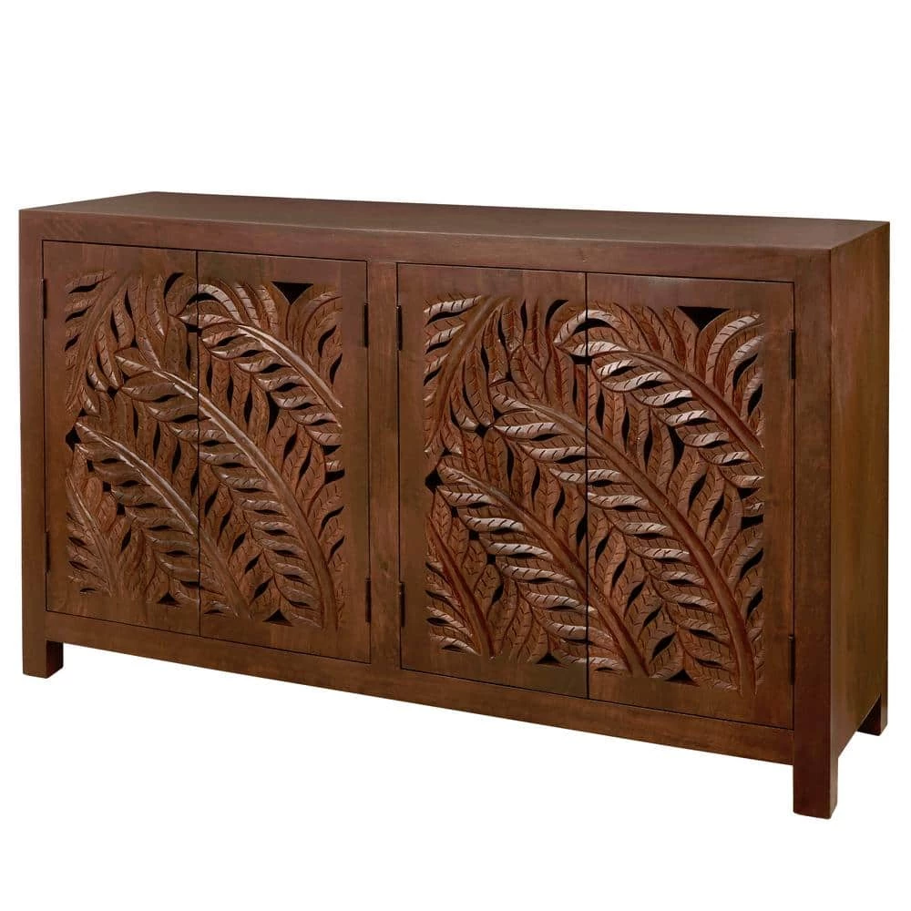 Create a stunning focal point in your bedroom with this HDC Palmeadow carved dresser. The solid wood frame and sturdy legs offer lasting durability, while the walnut finish adds a warm finishing touch. 4 carved doors keep your treasured items tucked out of sight, and the rectangular top provides ample display space for family photos, a jewelry box and other mementos. This HDC Palmeadow carved dresser arrives fully assembled, making it easy to give your room a quick makeover.