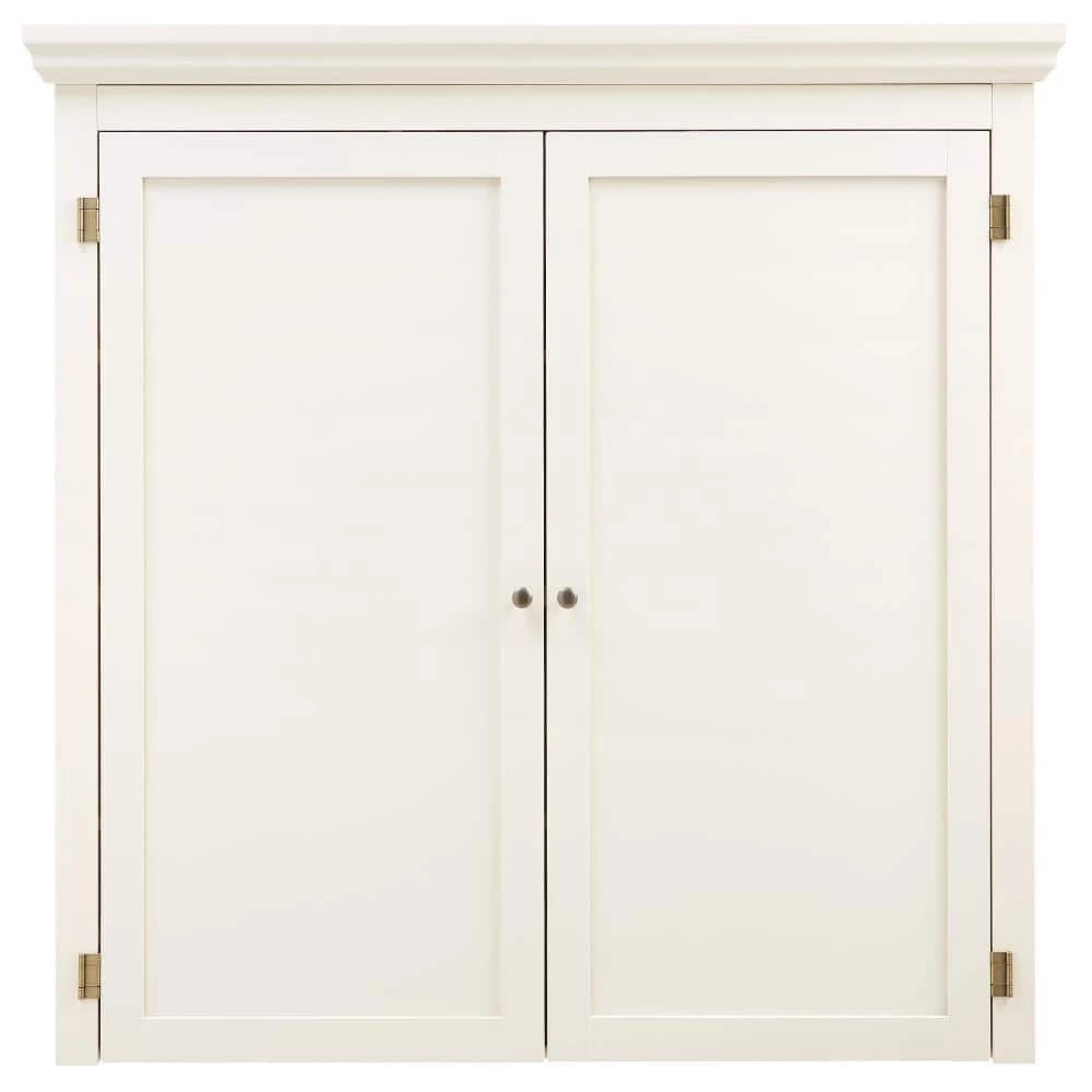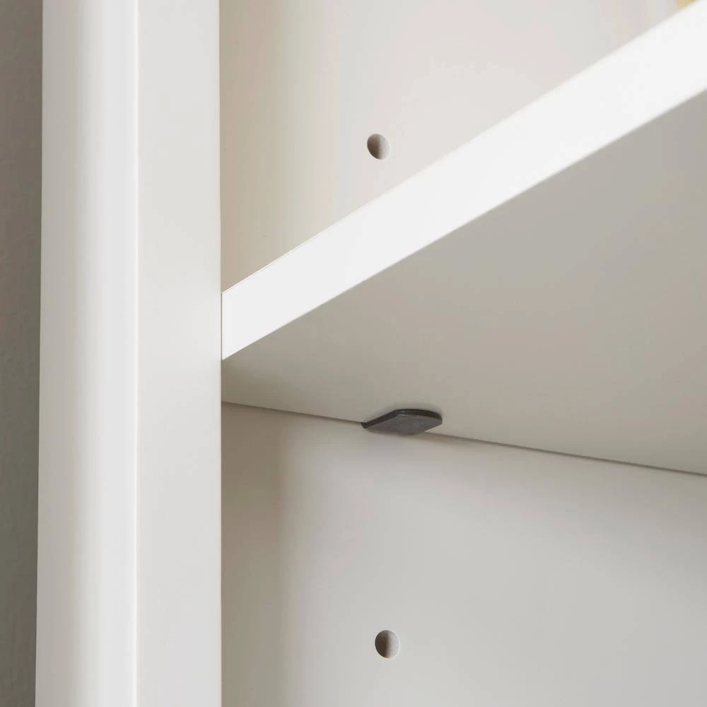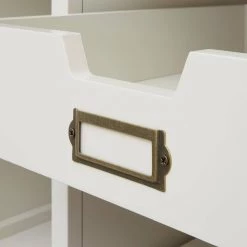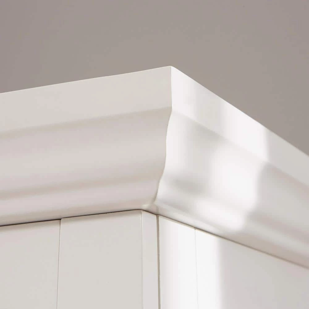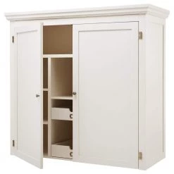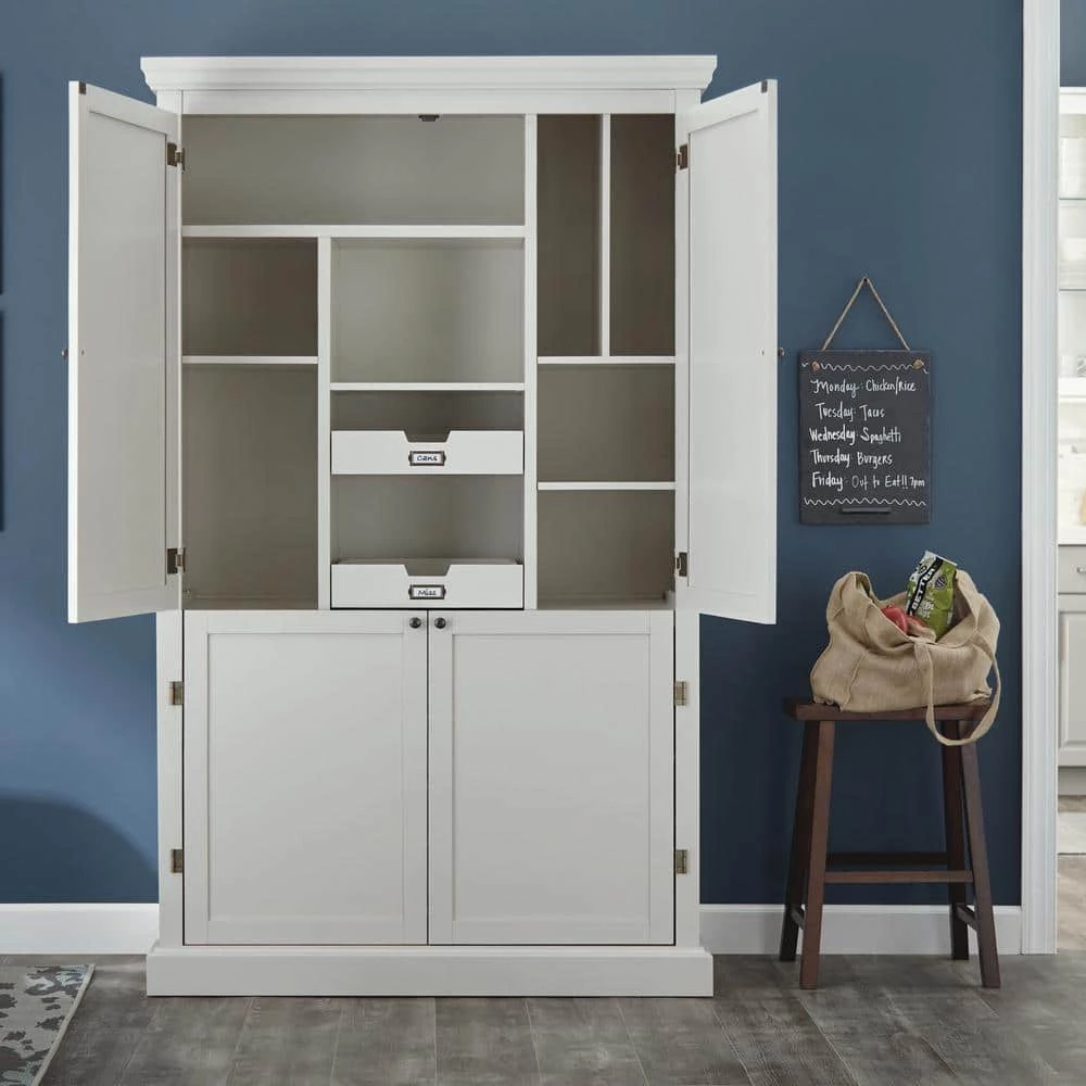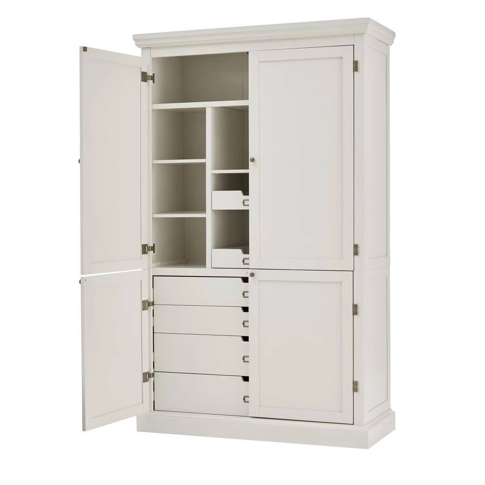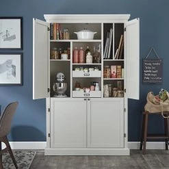 Part of the Prescott Modular Pantry Collection, the Top Cabinet is designed to be installed on top of any Base Cabinet, sold separately. This modular piece offers a myriad of storage options behind two doors. Both doors swing open 270 degree for easy access to the interior shelving. Magnetic closures keep the doors in position. Inside, a series of shelves and cubbies makes it easy to organize baking supplies and cooking necessities. Two removable trays with front label holders in an antique bronze finish keep spices, extra utensils and various other kitchen supplies organized and handy. The Prescott Top Cabinet’s bright polar white finish highlights the elegant crown molding and Shaker-style recessed panels for a charming, classic look. Combine this unit with more pieces from the Prescott Modular Pantry Collection to create kitchen storage that perfectly suits your needs.