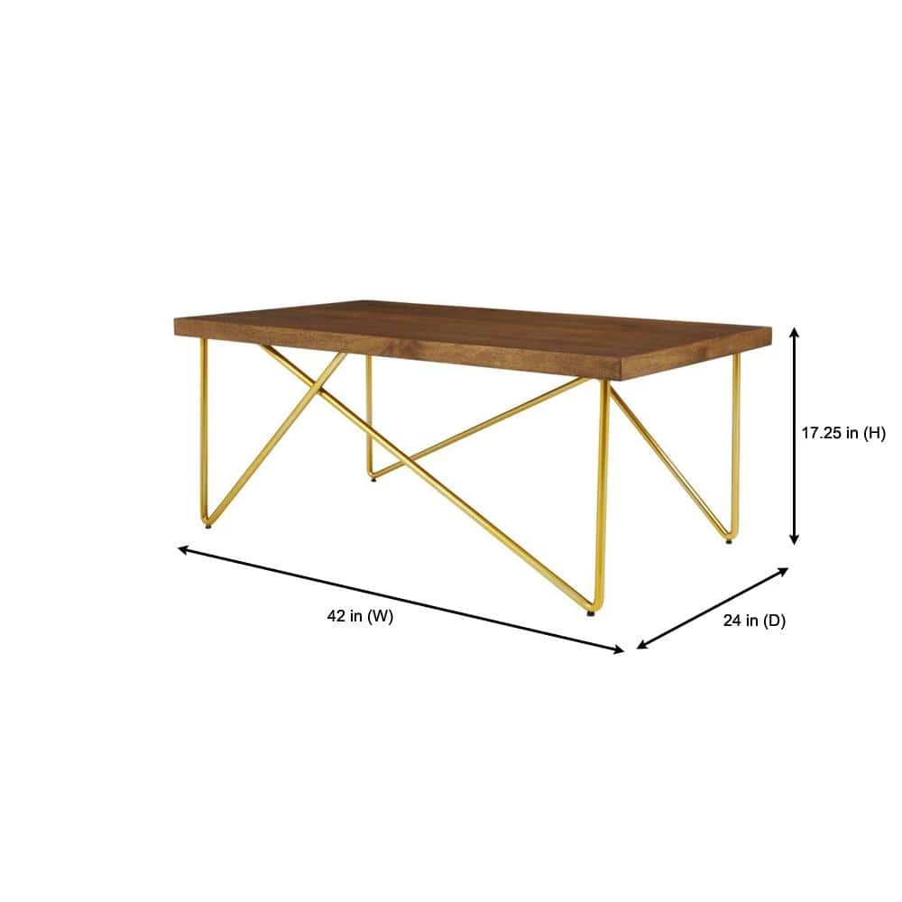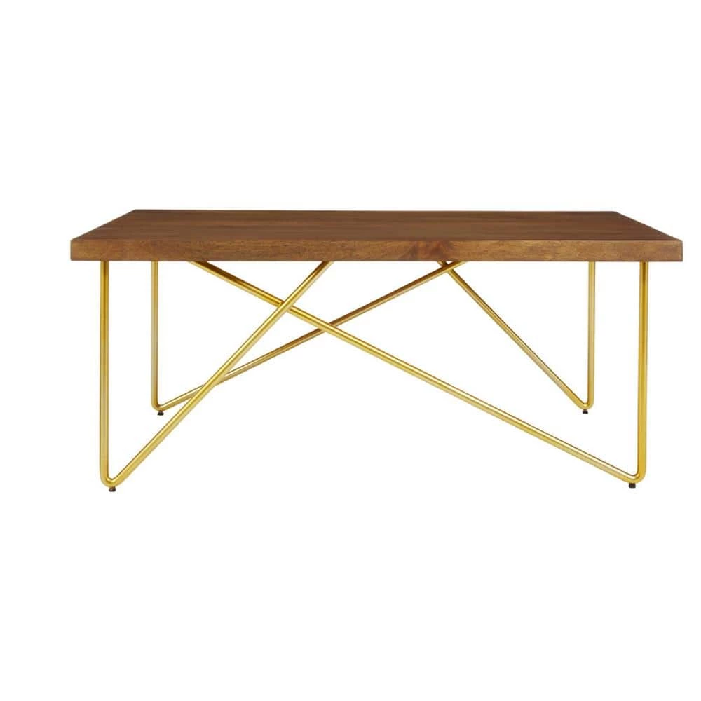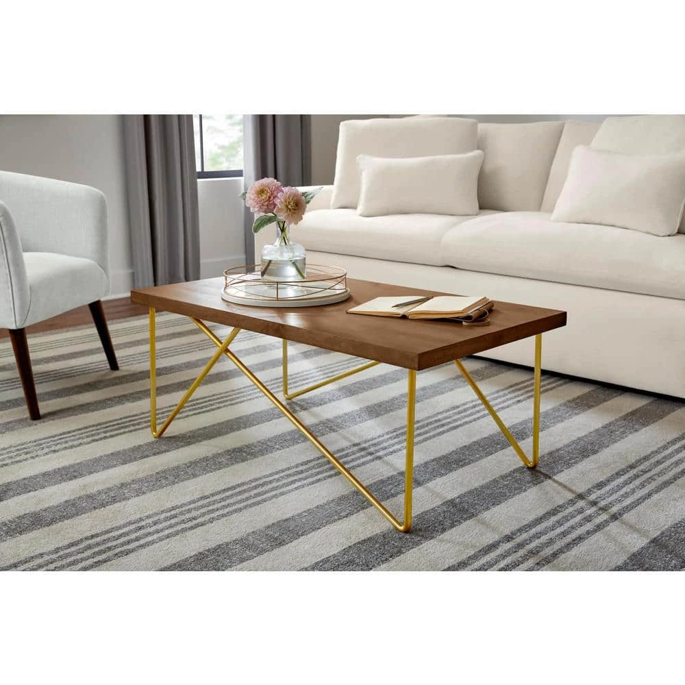 Our Home Decorators Collection coffee table celebrates modern design in a simple, yet mesmerizing, way. On top, the solid wood top adds warmth. Below, a brass-finished hairpin base lends a supporting role with plenty of polish. The table is a natural choice for sectionals, sofas and modern decor.