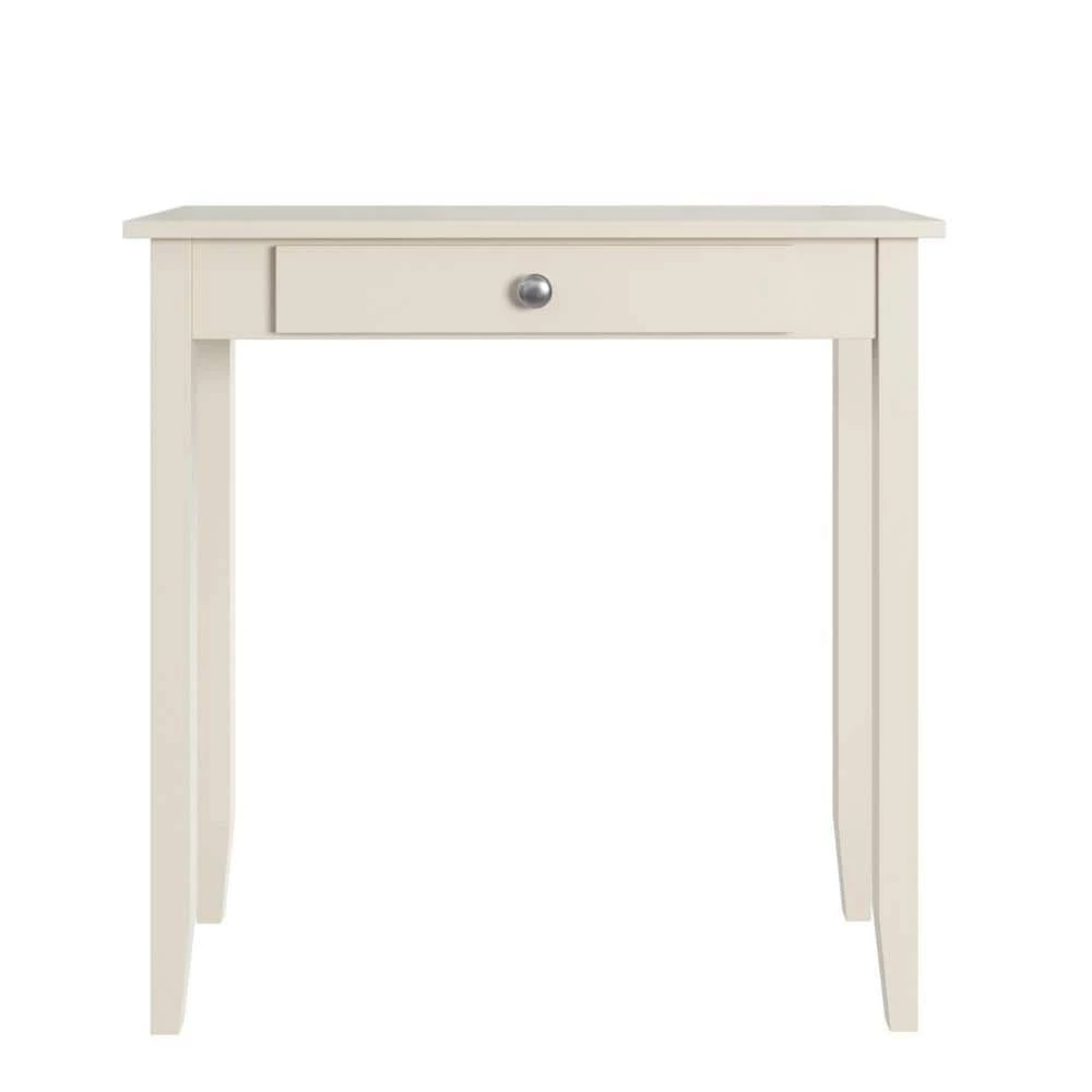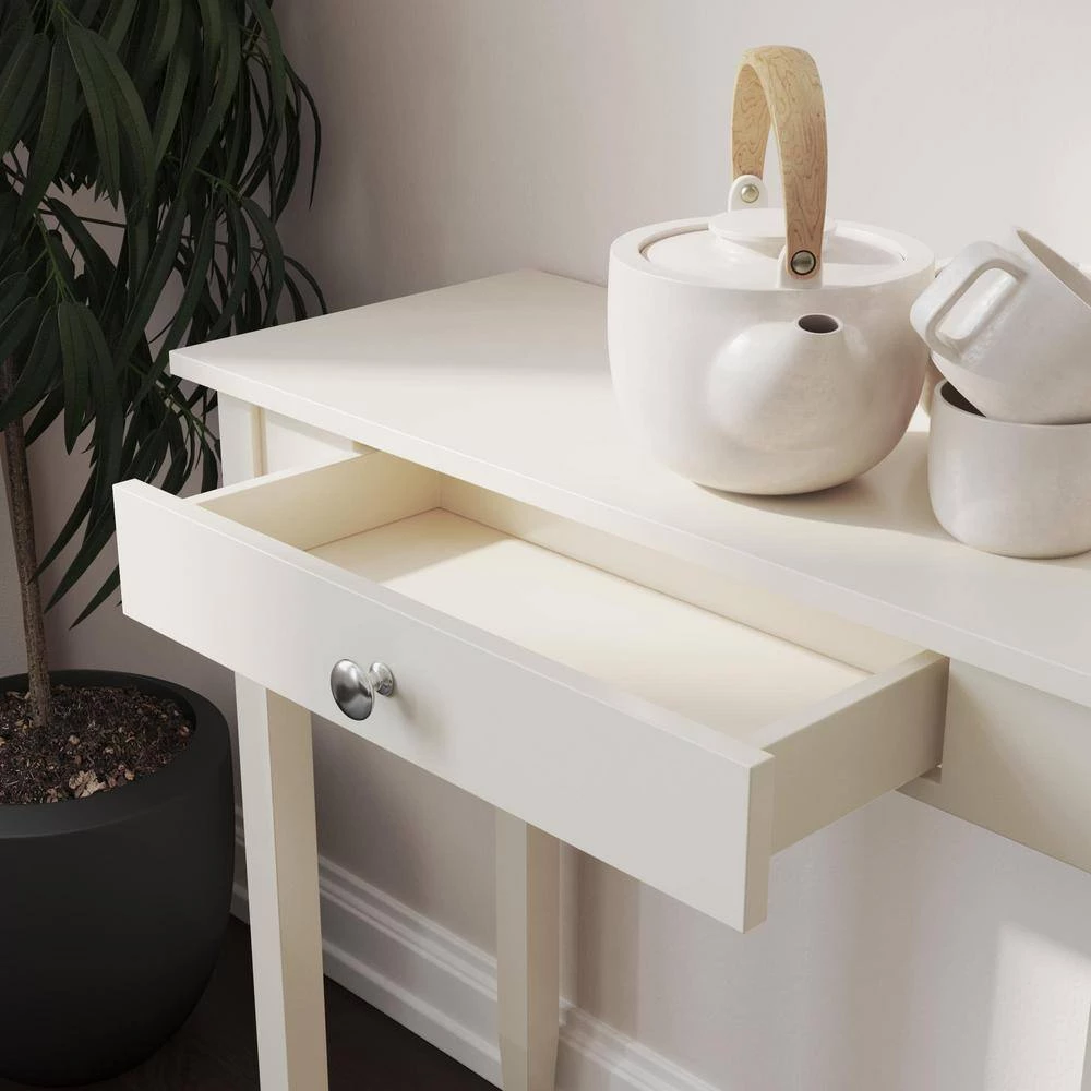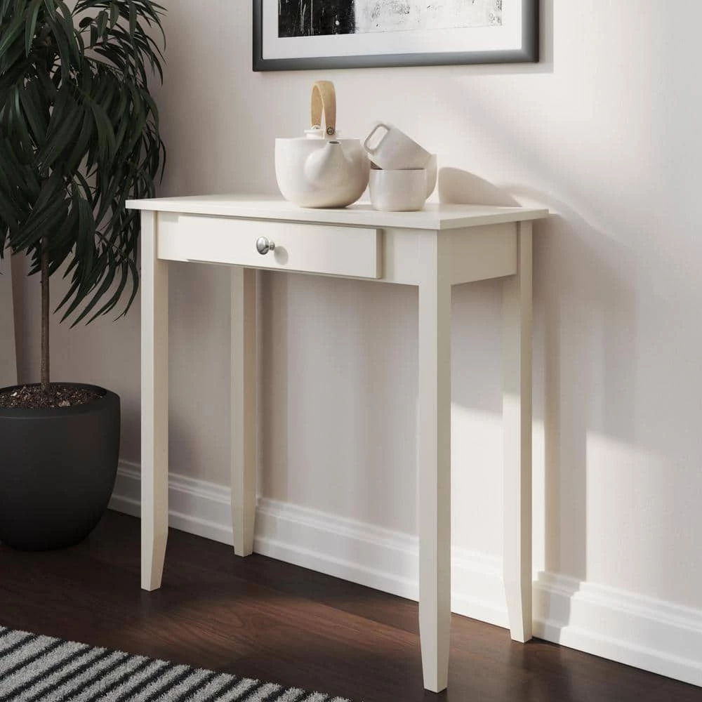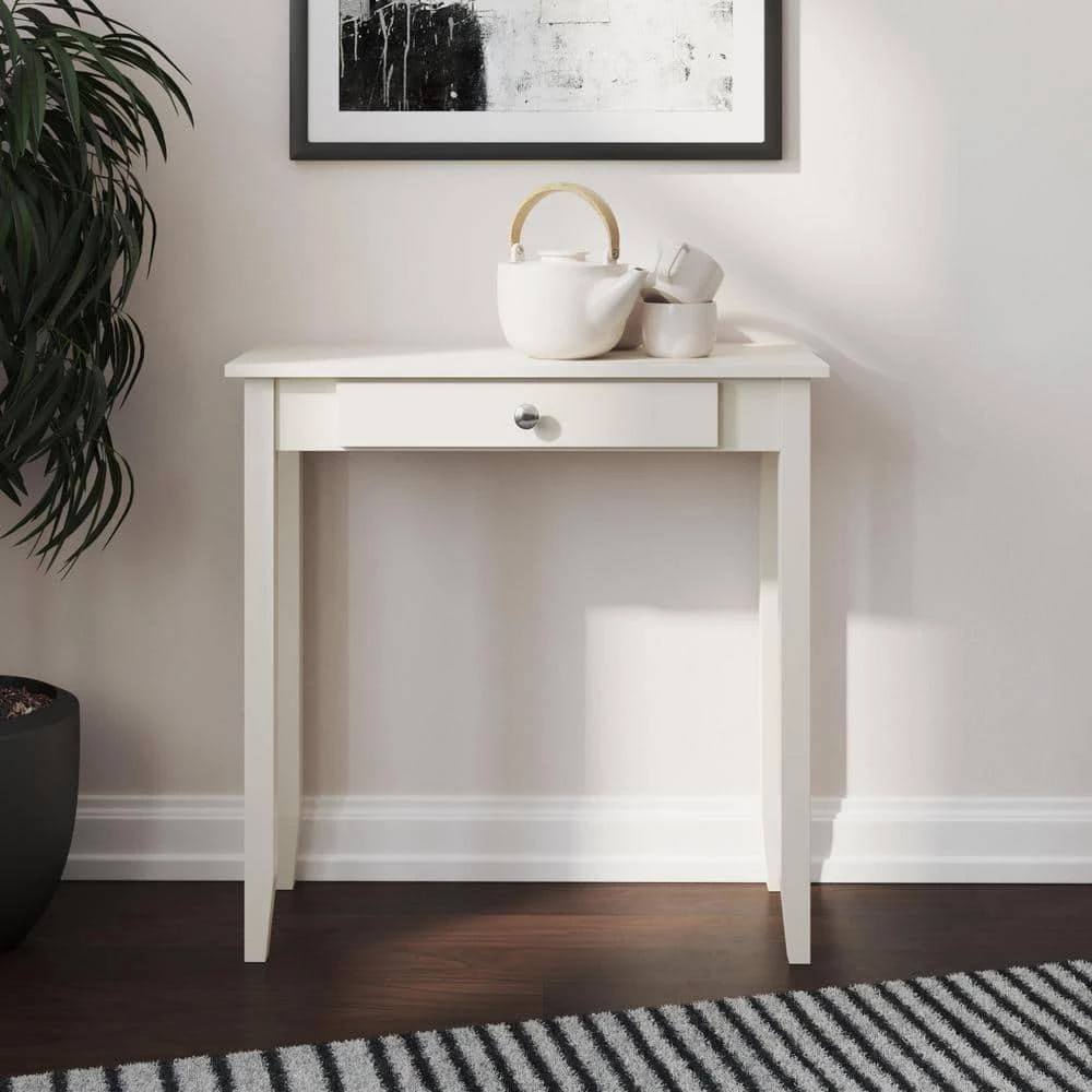 Accent your living room or bedroom with our DHP Rikki Console Table. This elegant table has a stylish, contemporary flair – perfect to liven up any room. Thanks to its compact size, it is ideal for any small living spaces. Designed with a practical drawer, this extra-storage space can be used to keep yourself organized. Whether it be used to place your keys or mail, contain the clutter with our console table. Use it as a statement-piece by simply adding a lamp, a picture frame or even a candle. Made with sturdy wood and wood veneers we guarantee that the table is both solid and durable. Choose from a variety of colors including White, Grey and Brown. Ships in one box for easy handling and assembles effortlessly. Our DHP Rikki Console Table is guaranteed to add style to your room.