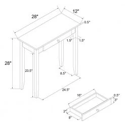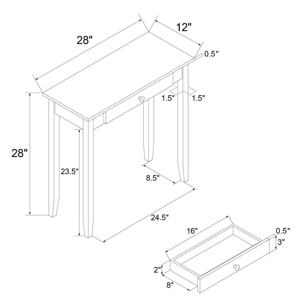 - Easy to assemble and ships in 1-box, table dimensions: 28 in. L x 12 in. W x 28 in. H. Weight limit: 50 lb. shipping dimensions: 30 in. L x 15 in. W x 5 in. H. shipping Weight: 19 lb.