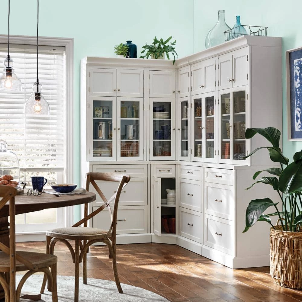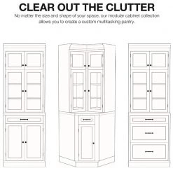 The Royce Modular Collection from Home Decorators Collection offers an easy way to create your perfect kitchen pantry without a costly remodel. All items in this collection boast generous crown molding, raised panels, a fresh true white finish and zinc hardware in a bronze finish. Each piece also features closed cubby-height cabinets above generous glass-door cabinets. Two of the pieces are standard freestanding cabinets; the third is a corner unit. This piece, the 3-Drawer Modular Storage Cabinet, is one of the standard cabinets. It features one short drawer and two taller drawers, perfect for keeping dish towels, wash rags, storage containers, baking accessories and other items organized and at hand. Put dishes and glassware on display behind the glass doors on two adjustable shelves; store even more in the cubby cabinets above.