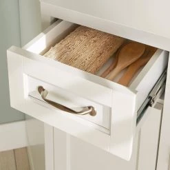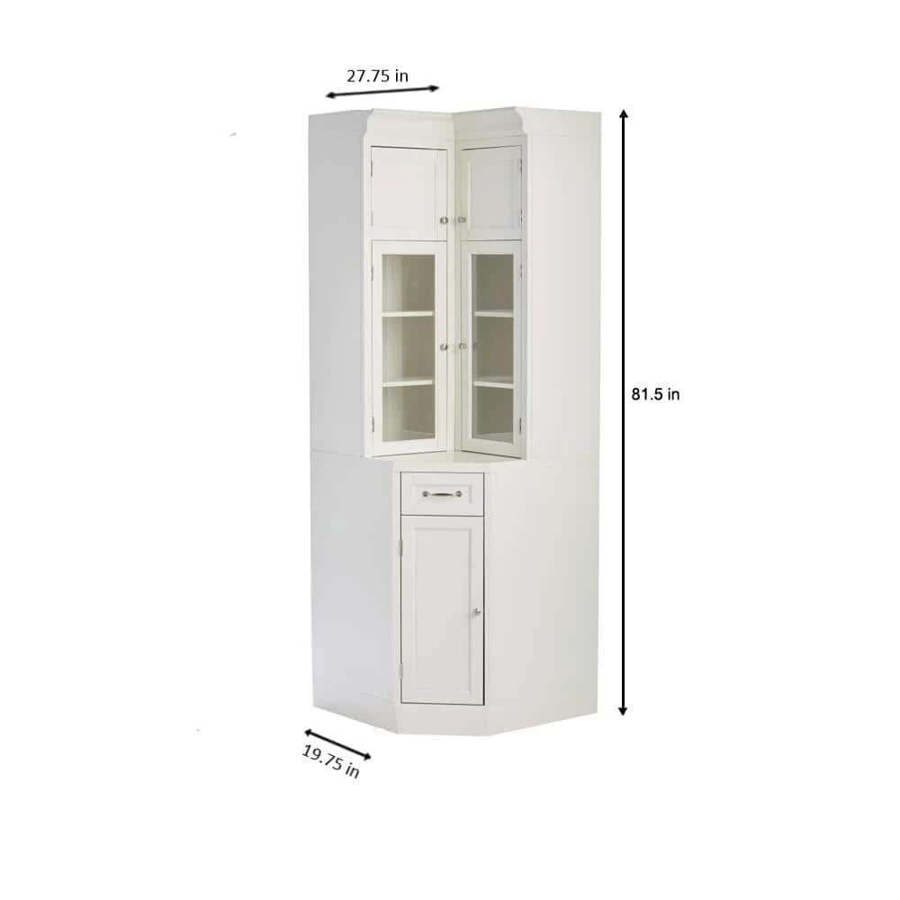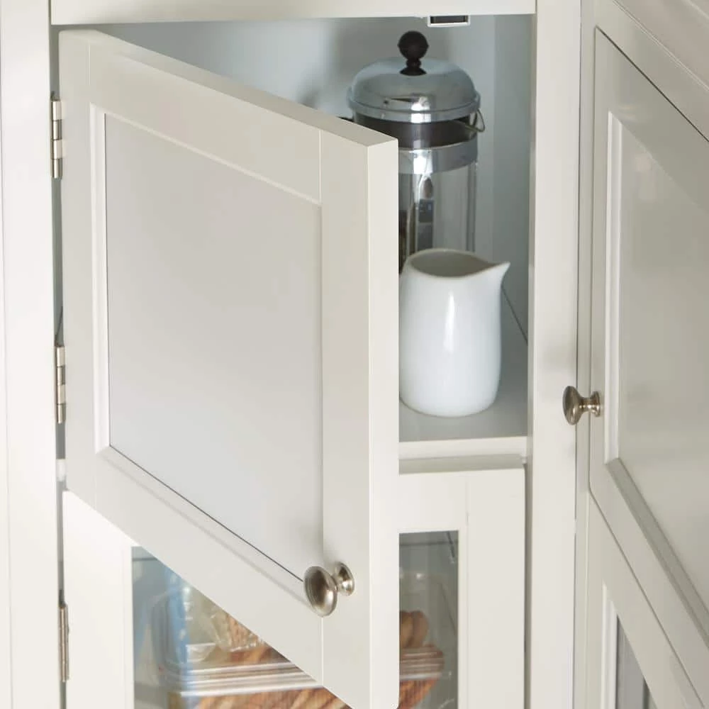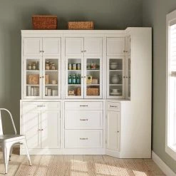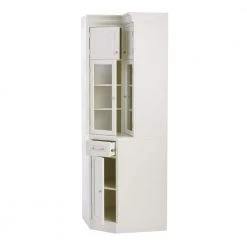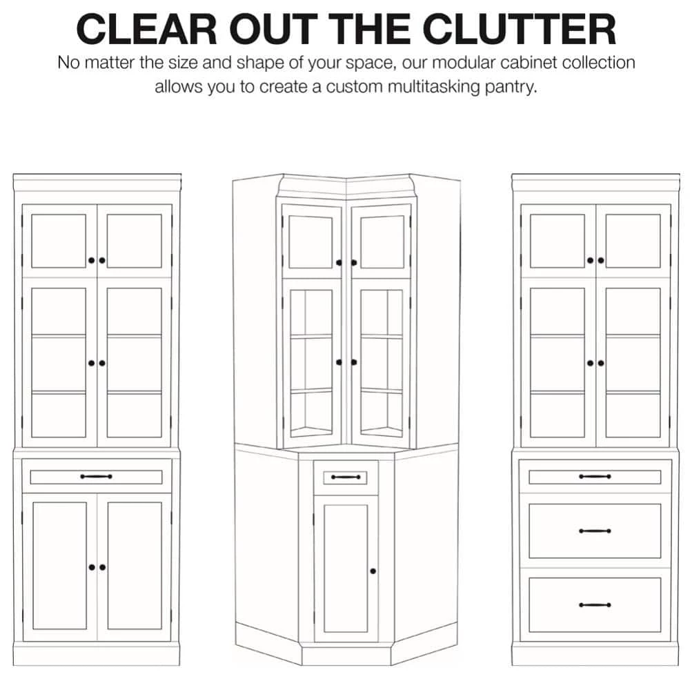 The Royce Modular Collection from Home Decorators Collection offers an easy way to create your perfect kitchen pantry without a costly remodel. All items in this collection boast generous crown molding, raised panels, a fresh true white finish and zinc hardware in a bronze finish. Each piece also features closed cubby-height cabinets above generous glass-door cabinets. Two of the pieces are standard freestanding cabinets; the third is a corner unit. This piece, the Corner Storage Cabinet, allows you to build your pantry along two connecting walls. Situate it in a corner and place any number of standard cabinets to either side. This convenient cabinet’s cubby and glass doors open inward, keeping them out of the way of other cabinets or your large appliances. Below the counter, a narrow drawer serves as a handy spot for accessories. And finally, a single door at the bottom opens to a roomy lower cabinet with an adjustable shelf.