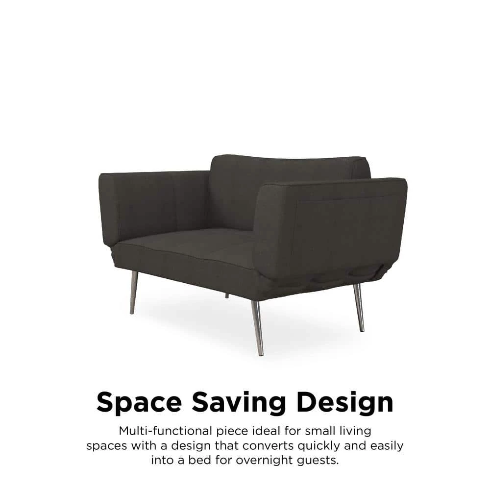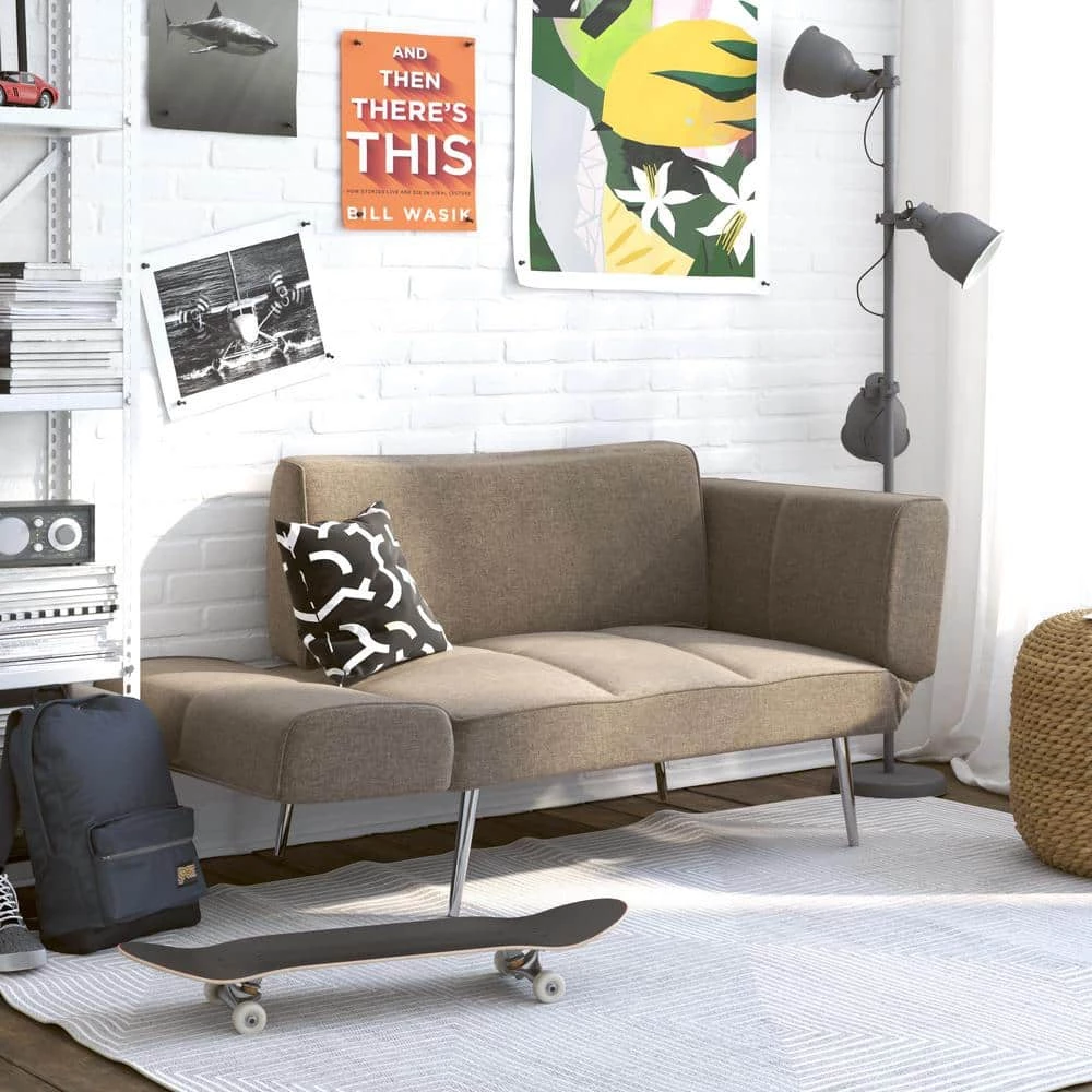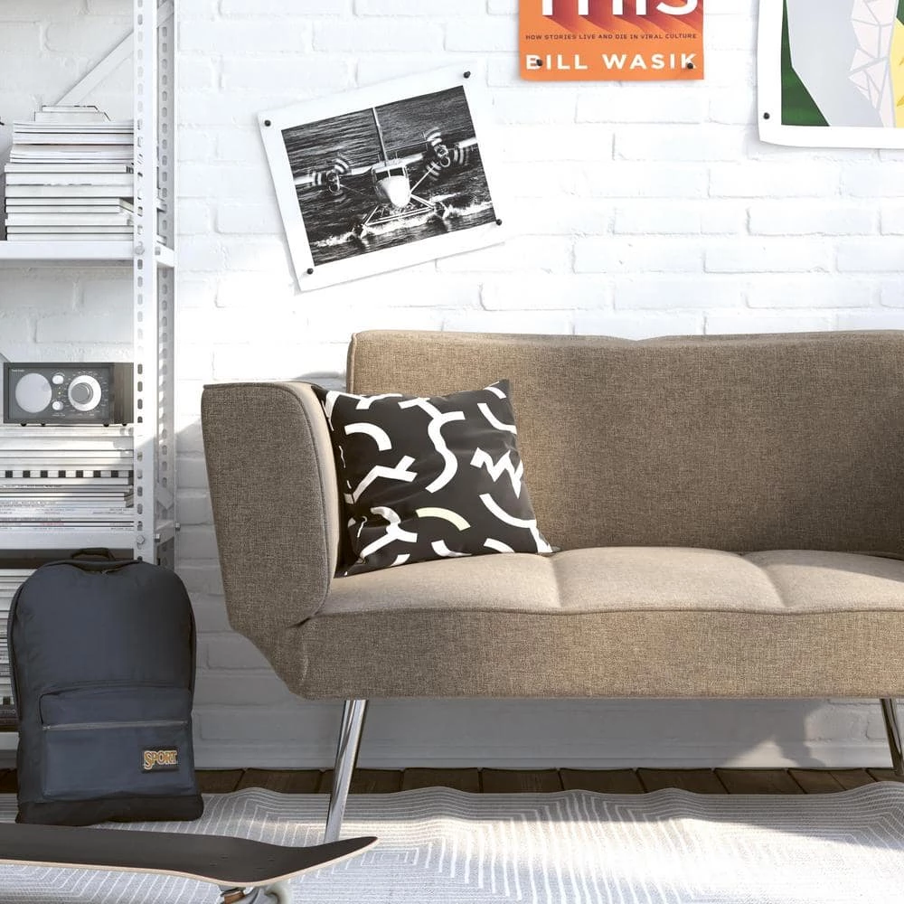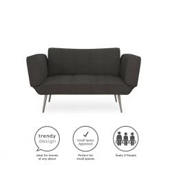 You will instantly become the envy of your family and friends with the DHP Ryana Upholstered Futon with Magazine Storage. This modern piece of furniture will have your living room or den space looking like a chic loft area in no time flat. Its design includes simple tufted seat stitching, bold seams and angled chrome legs to produce a distinctly attractive multiuse item. It features storage pockets on the outside of the armrests to store magazines, books or remotes to help keep your space clutter free. Moreover, this futon was engineered with a convertible design that allows you to recline the arms to create a convenient and comfortable sleeping area for your overnight guests. Available in an array of colors, its classic linen upholstery is easy to maintain while also being easy on the eyes. The addition of the Ryana into your home is just the style infusion that you need.