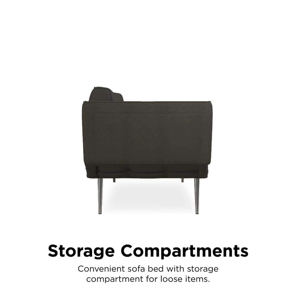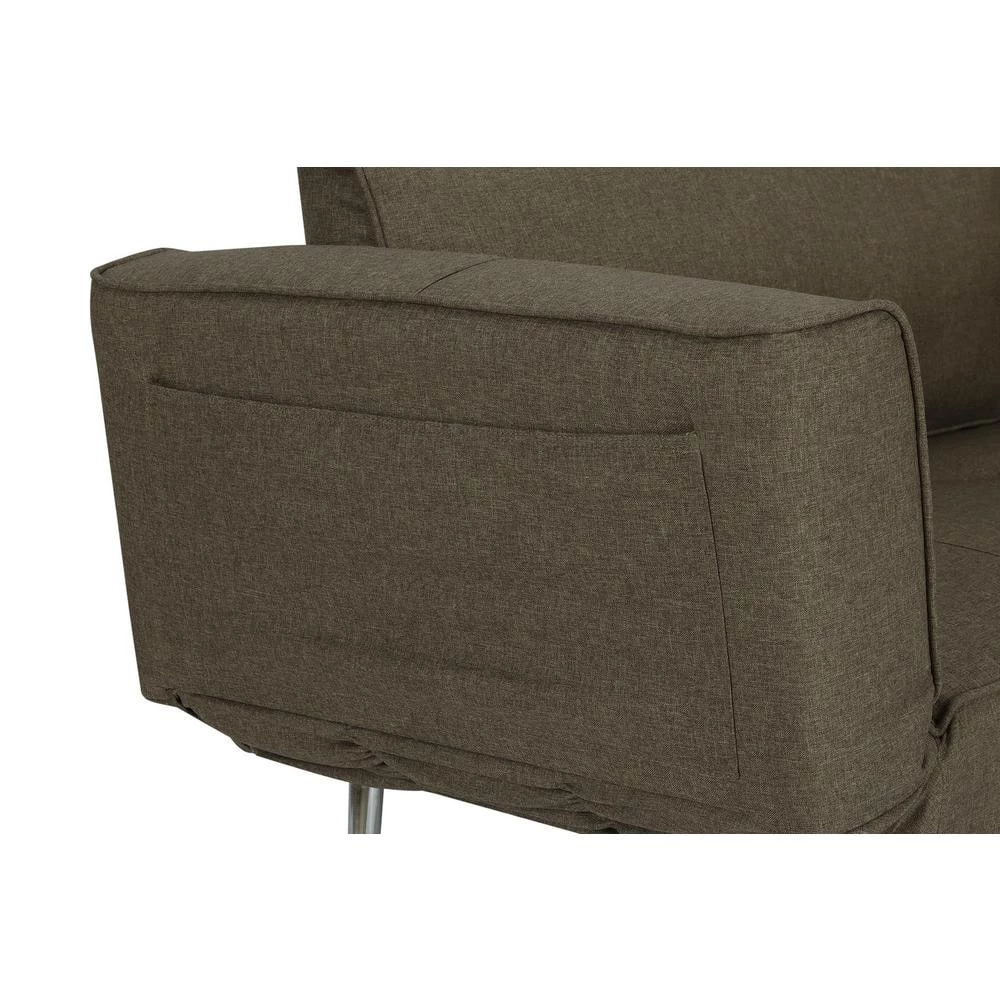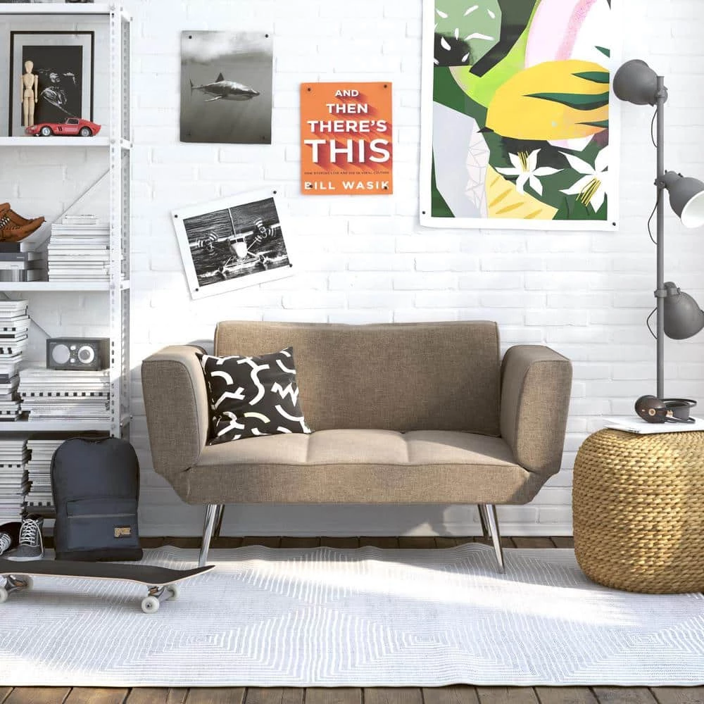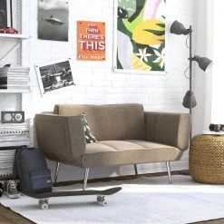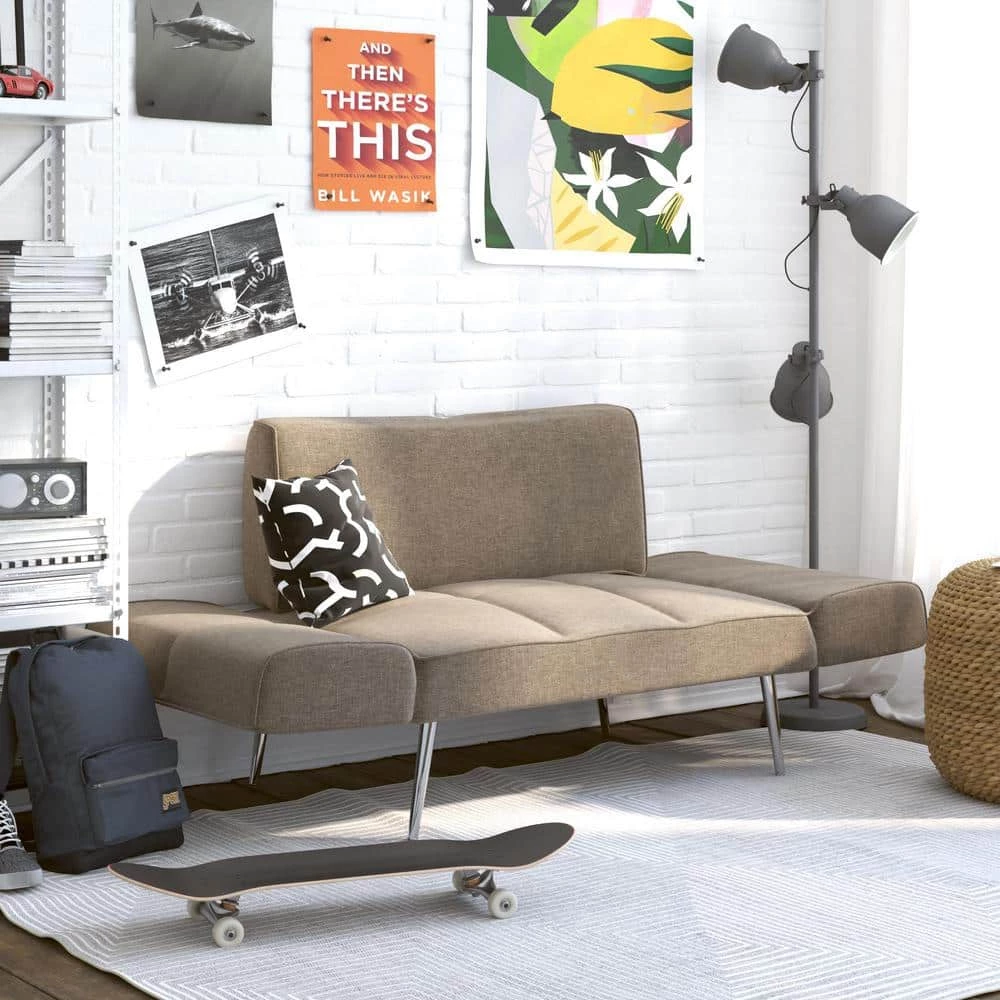 You will instantly become the envy of your family and friends with the DHP Ryana Upholstered Futon with Magazine Storage. This modern piece of furniture will have your living room or den space looking like a chic loft area in no time flat. Its design includes simple tufted seat stitching, bold seams and angled chrome legs to produce a distinctly attractive multiuse item. It features storage pockets on the outside of the armrests to store magazines, books or remotes to help keep your space clutter free. Moreover, this futon was engineered with a convertible design that allows you to recline the arms to create a convenient and comfortable sleeping area for your overnight guests. Available in an array of colors, its classic linen upholstery is easy to maintain while also being easy on the eyes. The addition of the Ryana into your home is just the style infusion that you need.