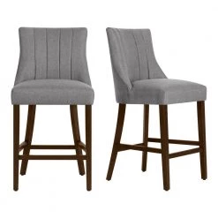 Pull up sleek, modern style to your kitchen island or counter with these bar stools. Two straight front solid wood legs and two splayed back solid wood legs in a smoke finish support the bar stools and give an eye-catching special design. Up top, the seat is upholstered in fabric and features a curved back with channel tufting, gives the most comfort and style looking. It would enhance your space and you will never disappoint with this choice of barstool.