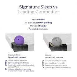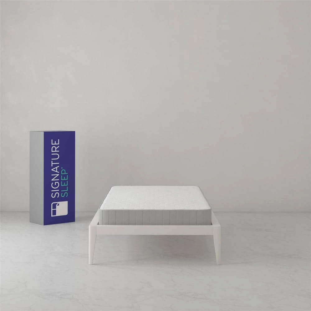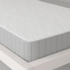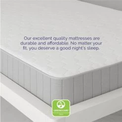 Finding the perfect mattress for a bunk bed can be tricky since picking the wrong type can lead to sleep disturbances and safety issues. Did you know that an innerspring mattress with a 6-inch maximum height is the most compatible sleeping accessory in this instance? Let’s introduce you to the Signature Sleep Peaceful 6″ Reversible Bonnell Coil Mattress. This flippable mattress was specifically designed to fit bunk beds, loft beds, low-profile beds, daybeds, and trundle beds for added versatility and can even be transported onto an RV for camping vacation sleepovers. Whether for a child, teen, or adult in a bedroom or guest room space, this tight-top mattress delivers a medium firmness comfort level most desired by back, side, and stomach sleepers for its ability to offer firm spinal support and equally essential curve caressing softness. Made with a lightweight dual-sided design to allow easy rotation and reduce wear and tear, it features a strong heavy-duty gauge steel bonnell coil core cushioned between comforting layers of thermobonded high-density polyester padding and a breathable quilted cover. Expertly crafted in Canada with the use of 50% recycled fibers to leave an eco-friendly footprint, this GreenGuard Gold Certified mattress also meets high standards for safe indoor air quality. Offered in Twin and Full size, it arrives at your door rolled and compressed in an easy-to-handle box with a worry-free 10-year limited warranty.