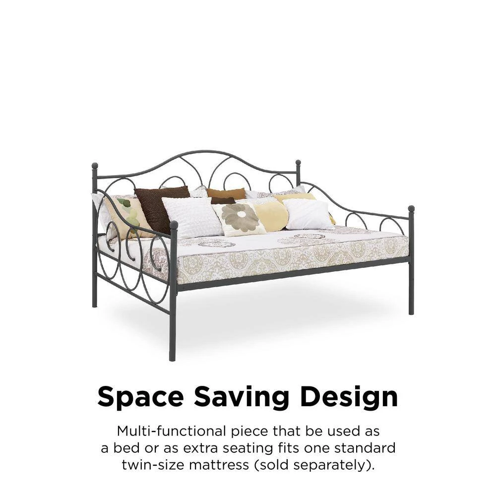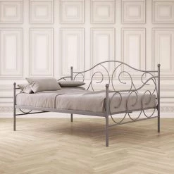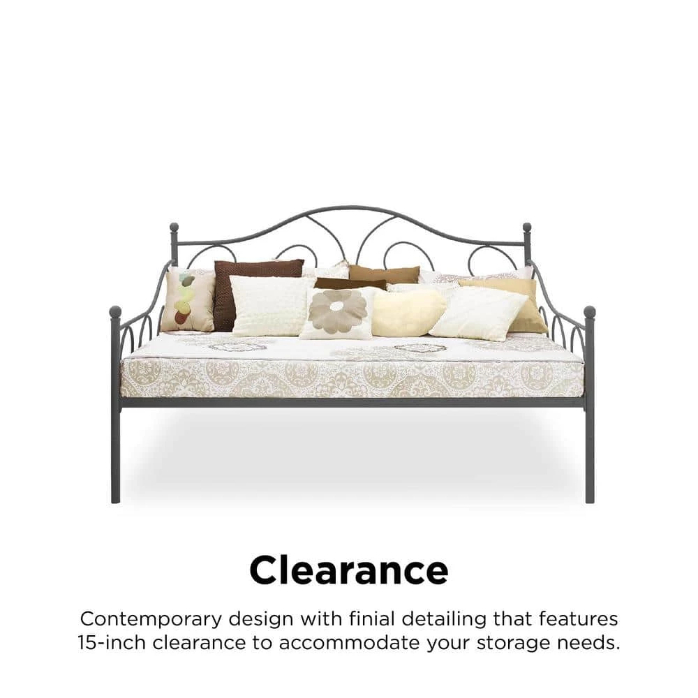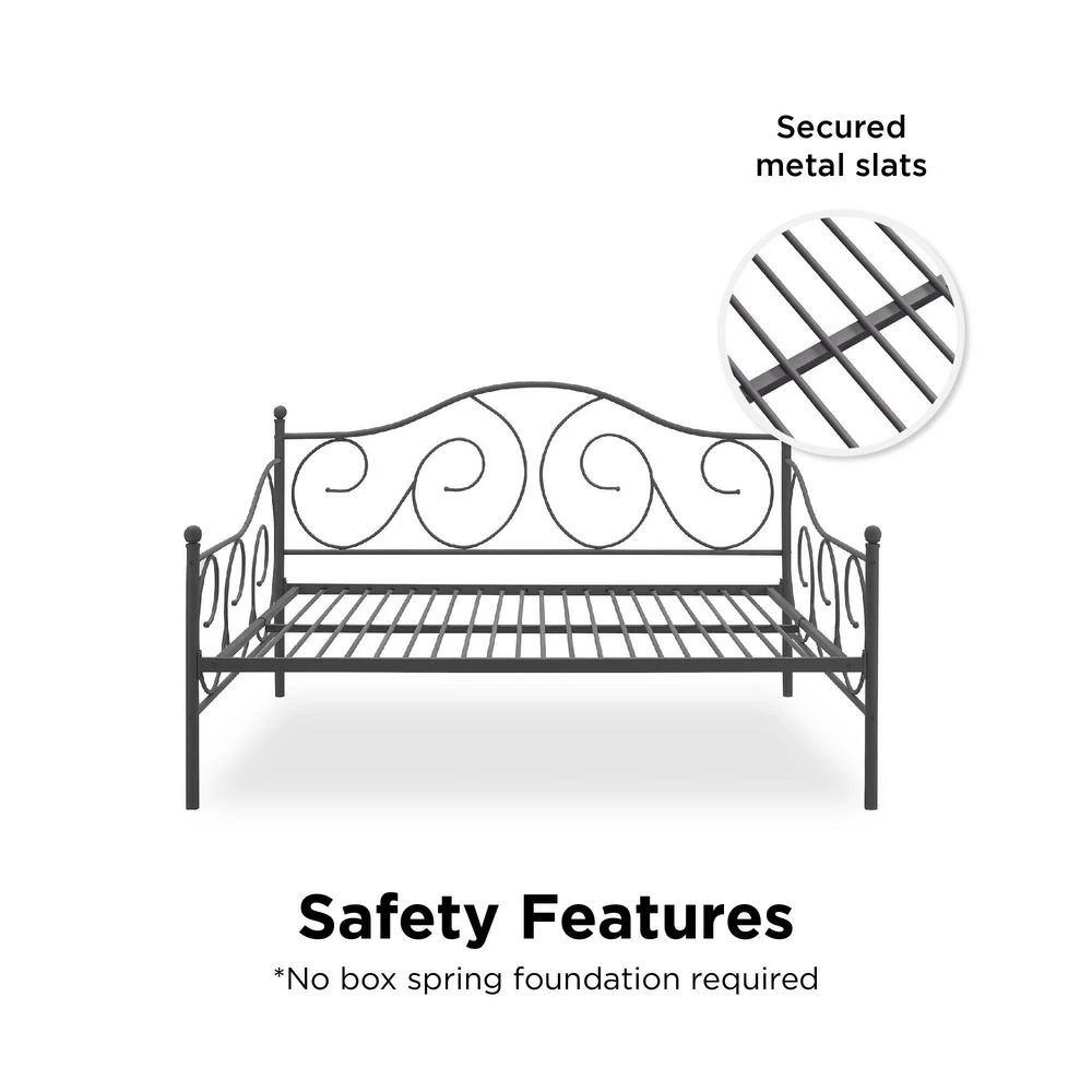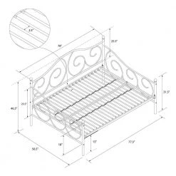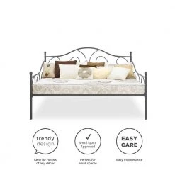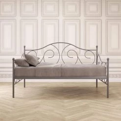 Add instant charm to your living room, bedroom or home office with the DHP Vanya Metal Daybed. Its classic look make this impeccable piece perfect to accentuate your home. Designed with versatility in mind, this daybed can be used as a couch in your salon or as a bed for overnight guests. The Vanya is made with finial posts and an elaborate carving in brushed metal to get an elegant Victorian style. The frame is constructed with a robust metal and includes secured metal slats and supporting legs to ensure stability, durability and comfort. Additional foundation is not required.