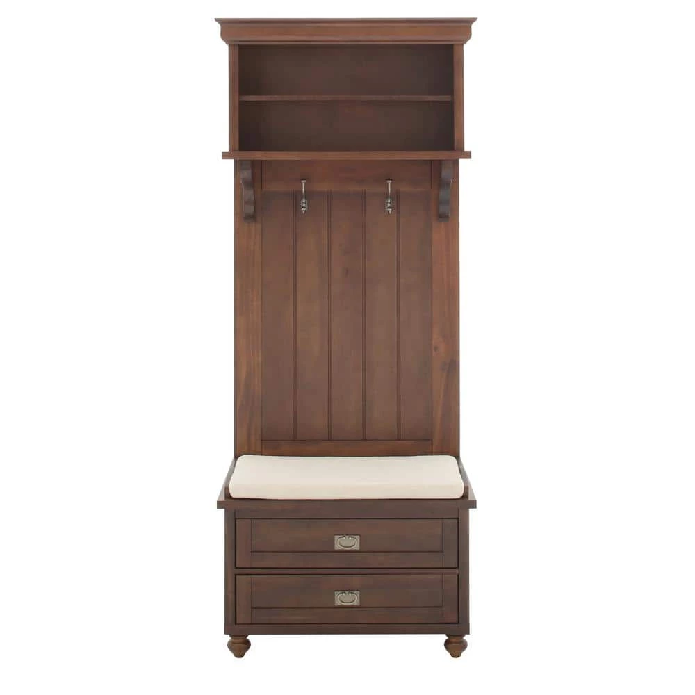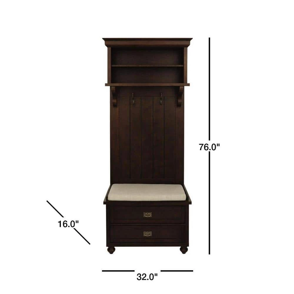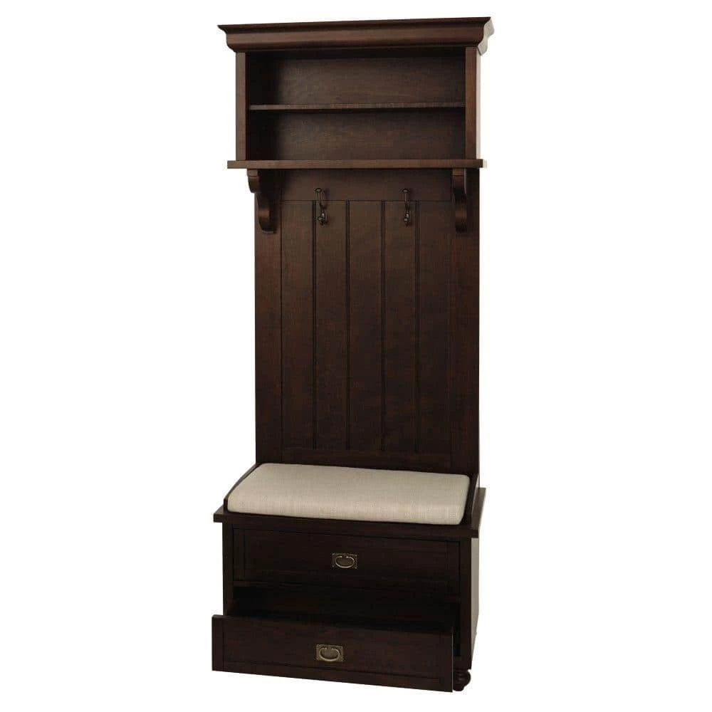 Slip stylish storage into a more modest entryway or mudroom with our Vernon Single Hall Tree. Featuring both the clean lines of modern furniture and classic design details like crown molding, beaded board, scalloped shelf supports and recessed panels, this entryway storage solution has versatile appeal. The Smokey brown finish gives this piece a rich, welcoming aesthetic. Store and display items on the 2 shelves, hang coats and bags from the 2 double hooks, hide away accessories in the 2-drawers and have a seat on the comfy cushion.