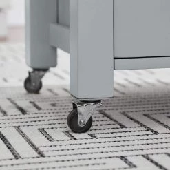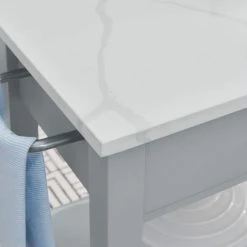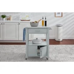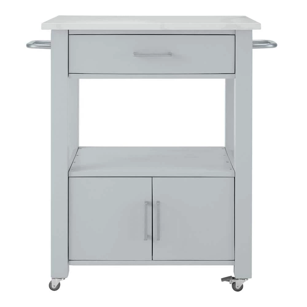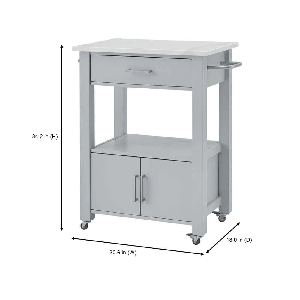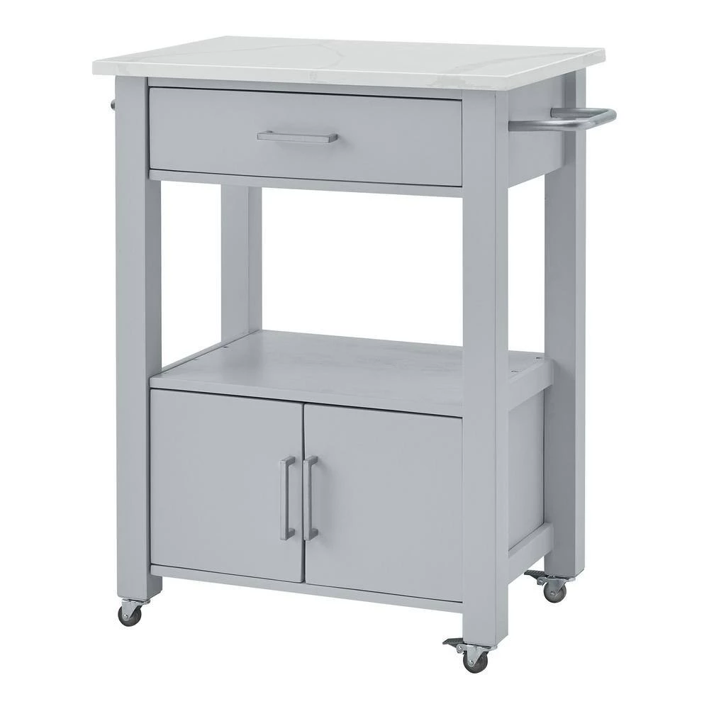Keep clutter under wraps with the Small Vining Kitchen Cart in Modern Gray by Home Decorators Collection. A cabinet and drawer provide concealed storage for cookware, countertop appliances and cutlery, while the open shelf creates space for baskets of produce or snacks. Use the stone-finish top as extra counter space in a smaller kitchen. This cart features a towel bar to keep your favorite apron easily accessible. Locking casters roll effortlessly across your floor, making it simple to bring the Small Vining Kitchen Cart to your dining room during dinner parties. Additionally, you can pair this cart with the larger Vining Kitchen Cart in Modern Grey that is offered by Home Decorators Collection for added working space and storage. While only partial assembly is required, we do recommend two people as the marble top is heavy.