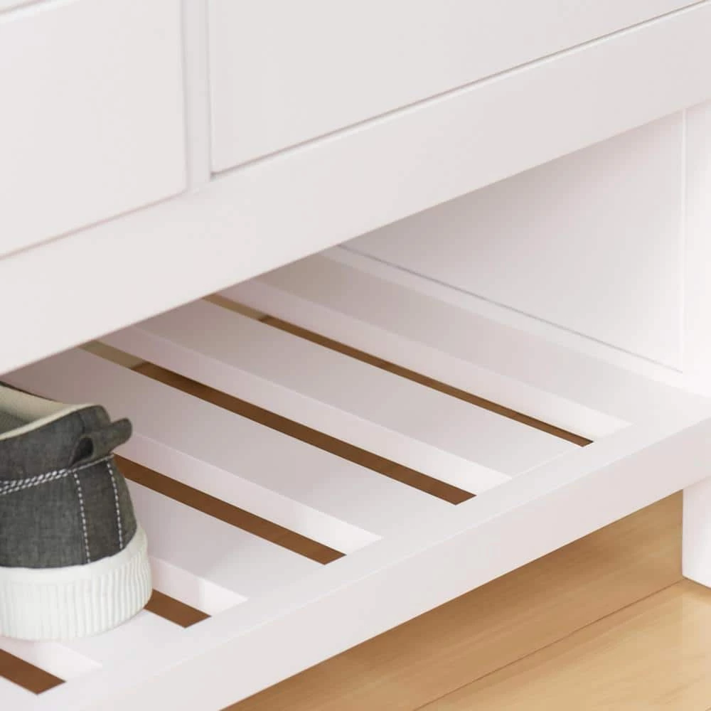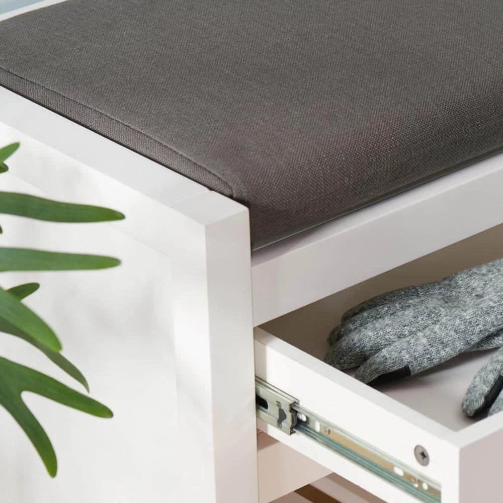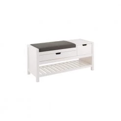 Our Home Decorators Collection entryway bench is smartly designed so everything is comfortably within reach. Relax on the cushioned seat and even more so because it cleans easily if dirt or spills should occur. A smoothly finished table surface holds beverages, keys and mail. Stow hallway and mudroom gear in the two drawers, while the lower shelf easily fits multiple pairs of shoes. The white backless bench’s streamlined design blends in with any modern room.